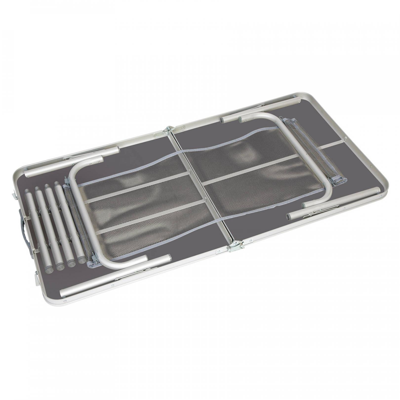 Алюмінієвий стіл Bo-Camp Case Model 120x60 cm - довгий, але при цьому компактний у складеному вигляді стіл для повноцінного розміщення шістьох персон. При цьому ніжки столу регулюються по двом рівням висоти (36/70 см). Ніжки столу можна відрегулювати на нерівній поверхні за допомогою гвинтів. Як зазначалось, стіл можна дуже компактно зберігати і переносити у вигляді кейса, завдяки знімним ніжкам, складаній стільниці і ручці. Із додаткових зручностей варто відзначити, що стіл оснащений знімною сіткою, що розташовується під стільницею.