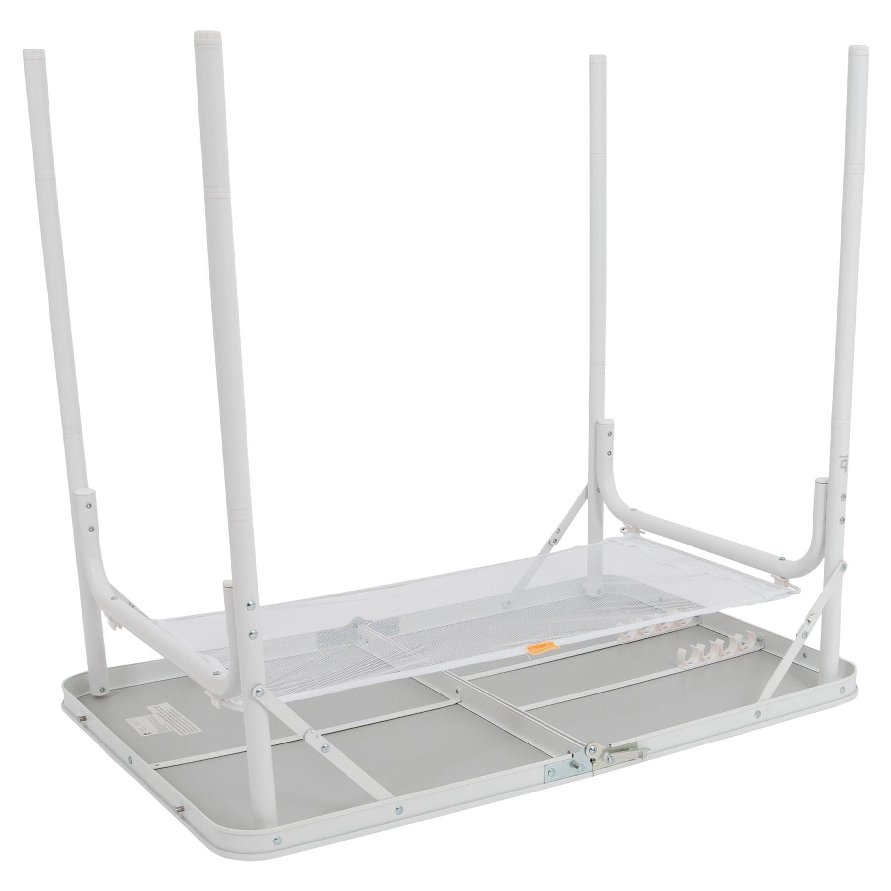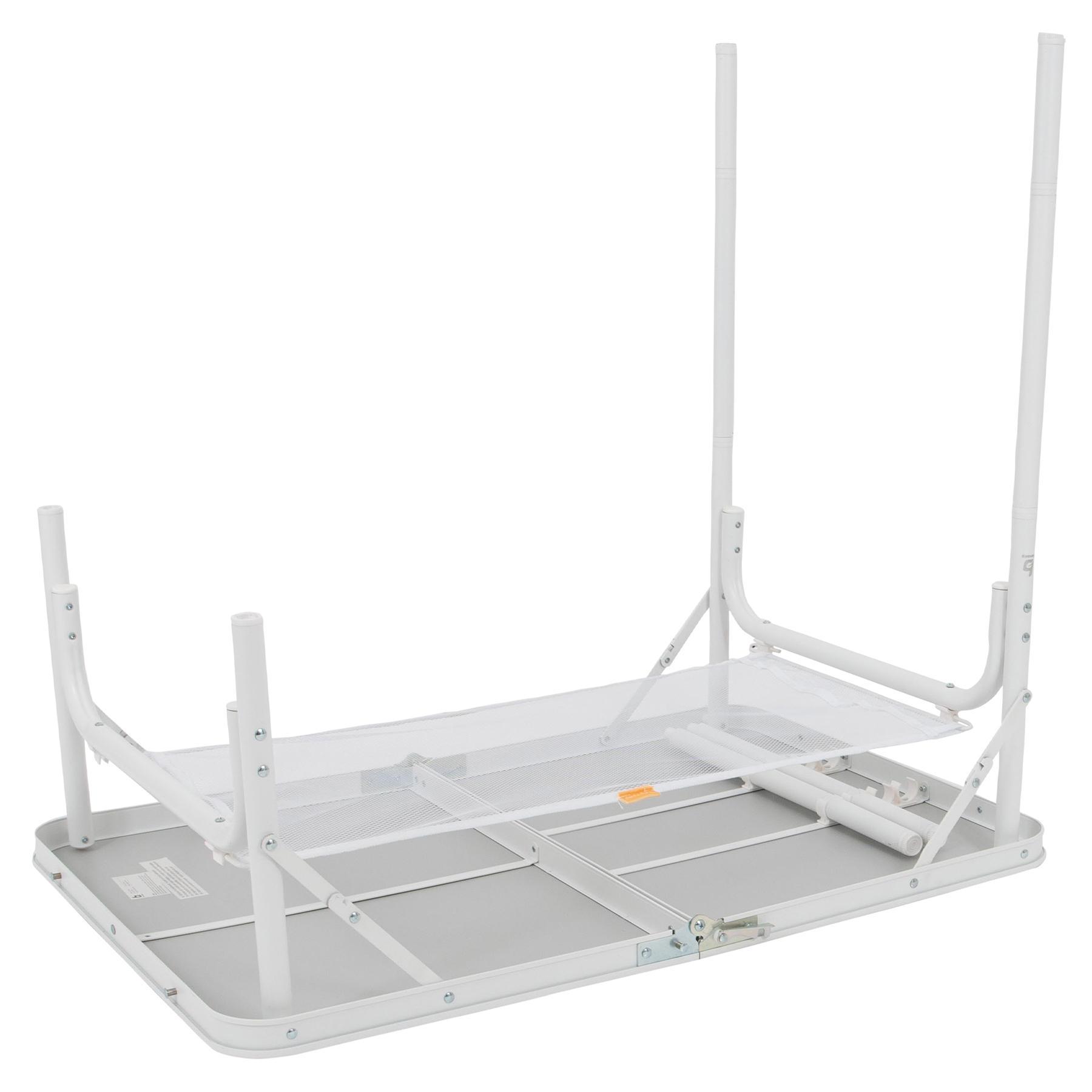 Ніжки з точним гвинтовим регулюванням легко виставляються навіть на нерівній поверхні. Стіл має складану стільницю та знімні ніжки, завдяки чому компактно складається у форму валізки (всього 60x45x7 см). Під стільницею передбачено сітчасту полицю для зберігання речей, а зручна ручка дозволяє легко переносити стіл.