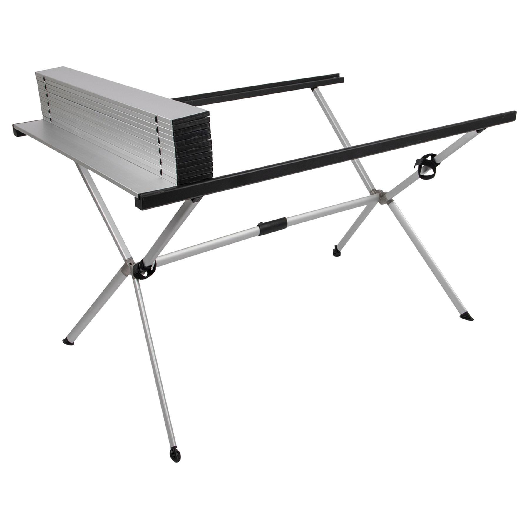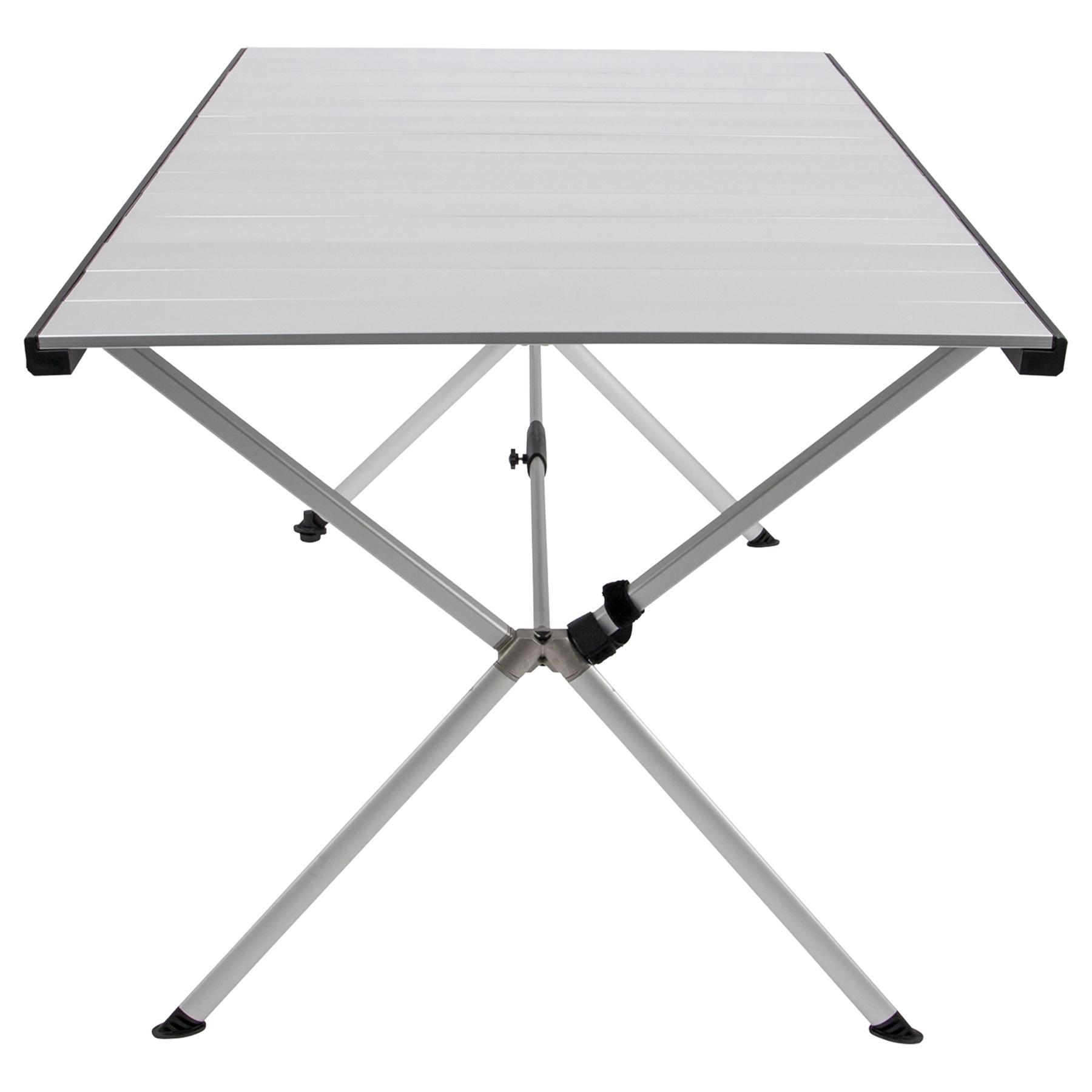 Bo-Camp Lamel 121x80 cm - це невисокий та стійкий стіл з широкою і довгою алюмінієвою стільницею відмінної якості, який у складеному вигляді вміщується в циліндричний чохол у вигляді тубуса. Стільниця виконана з алюмінію - гігієнічного матеріалу, який не боїться намокання і впливу сонячного випромінювання. Ширина і довжина стільниці більші за загальноприйняті стандарти, тому за столом комфортно зможе розміститися компанія з 6-8 людей, не заважаючи один одному. Одна з ніжок столу має гвинтову пластикову п'яту, що дозволяє надійно встановити стіл на нерівній поверхні та уникнути похитування.