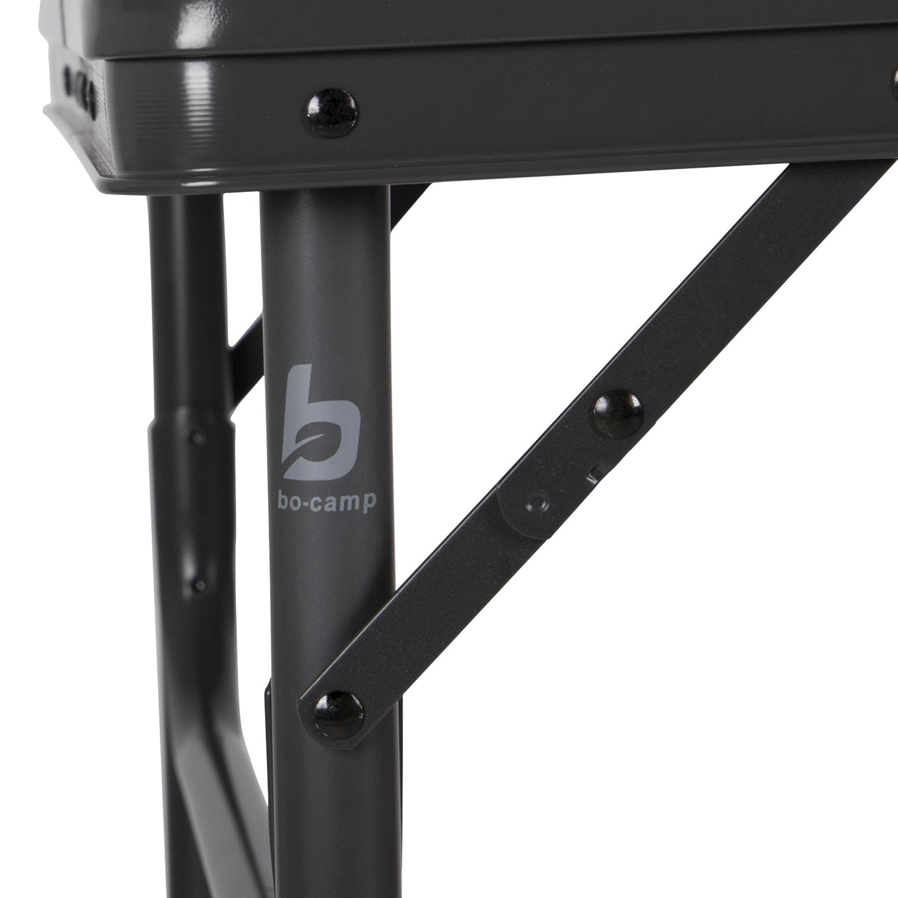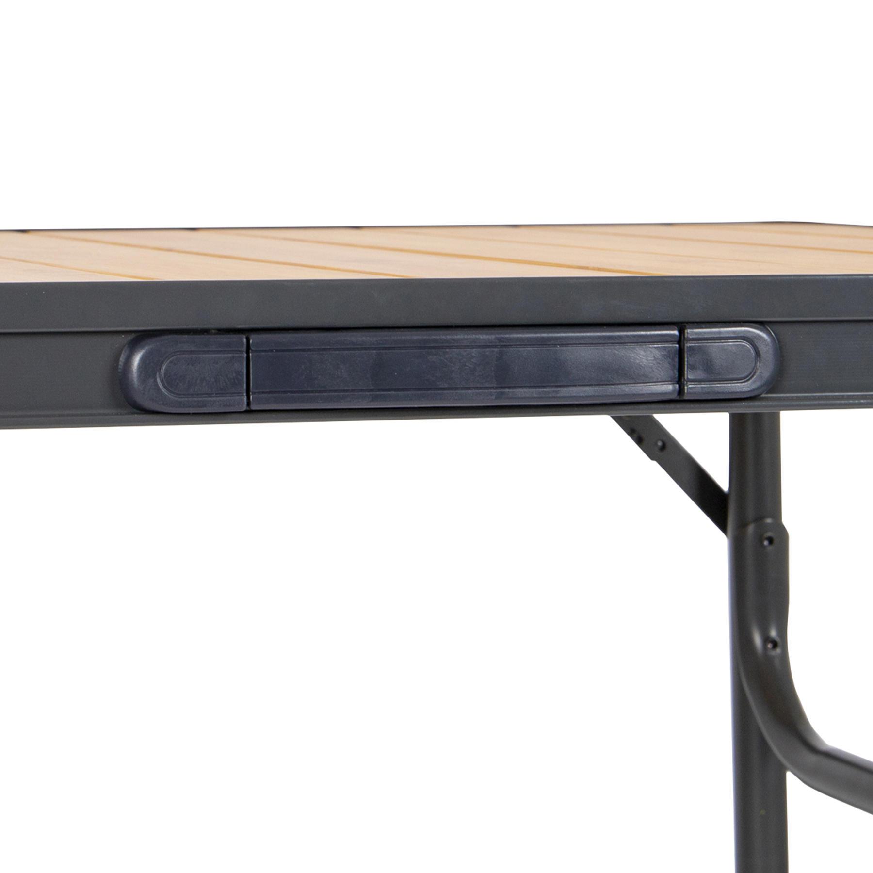 Каркас виконаний з легкого, але міцного алюмінію, що забезпечує стійкість при вазі всього 4.3 кг. Складані ніжки дозволяють швидко та зручно складати стіл, а завдяки вбудованій ручці для перенесення його зручно транспортувати. Стіл має регульовану висоту (31/71 см), що дозволяє легко адаптувати його як до обіднього столу, так і до кавового варіанту. Алюмінієвий кант по периметру стільниці не лише додає міцності, але й захищає краї від пошкоджень.