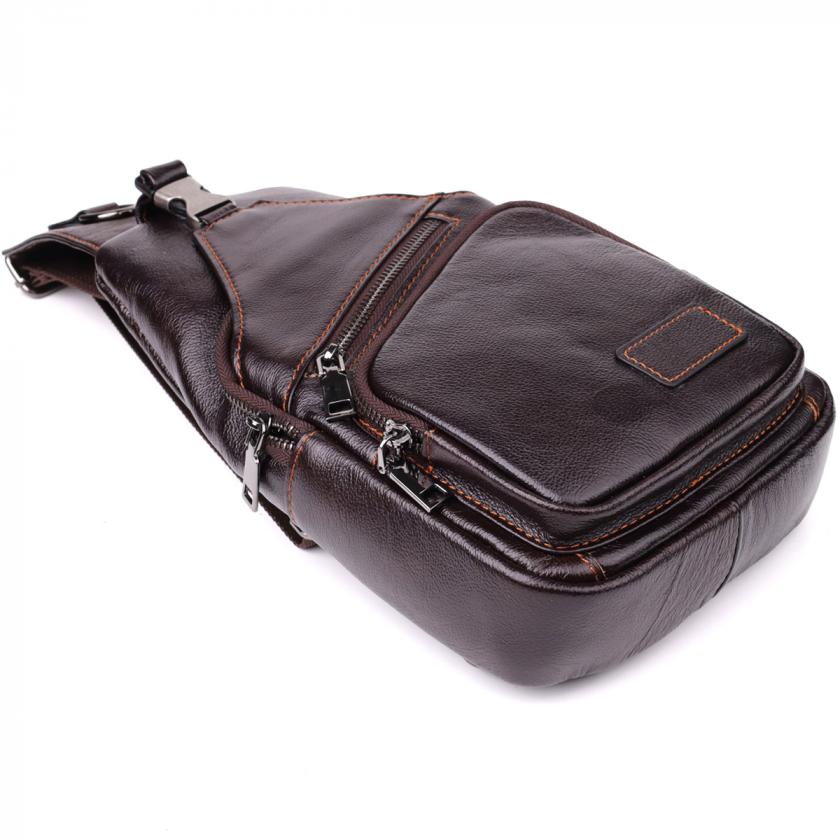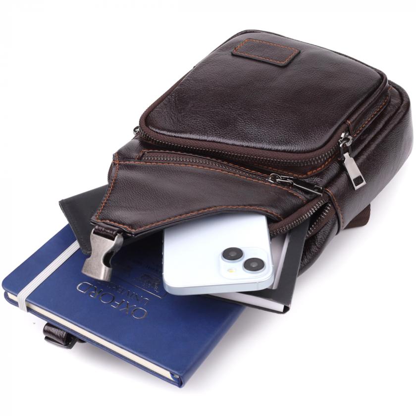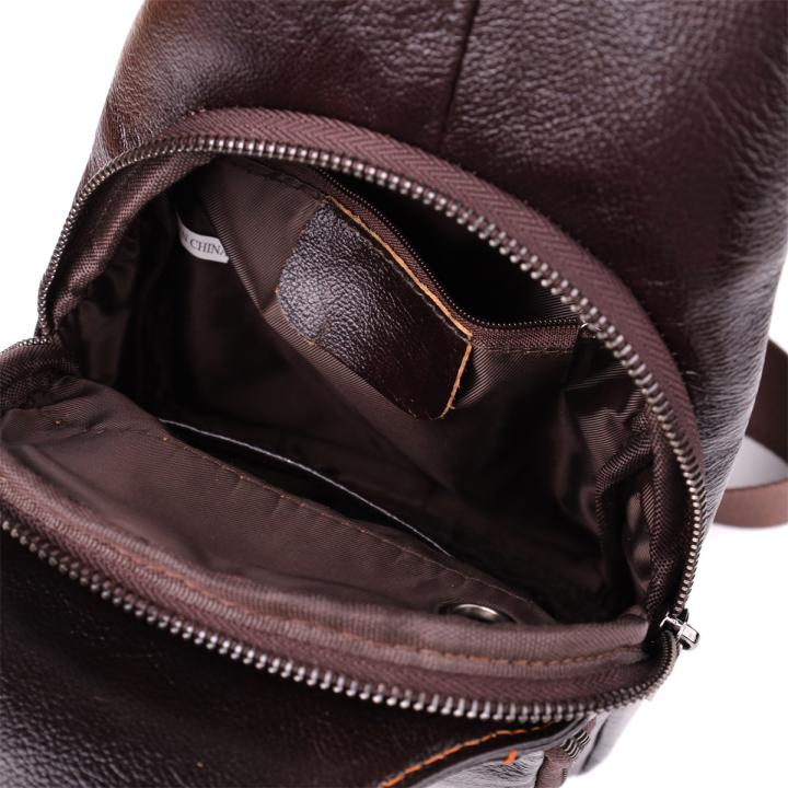 Стиьная мужская кожаная сумка через плечо отличается продуманным дизайном и функциональностью. Одно основное отделение на молнии обеспечивает надежное хранение вещей. Внутри расположены два кармана — один на молнии для ценных предметов и один открытого типа для быстрого доступа.