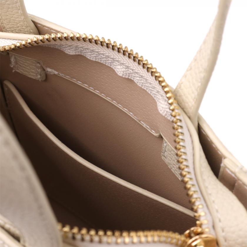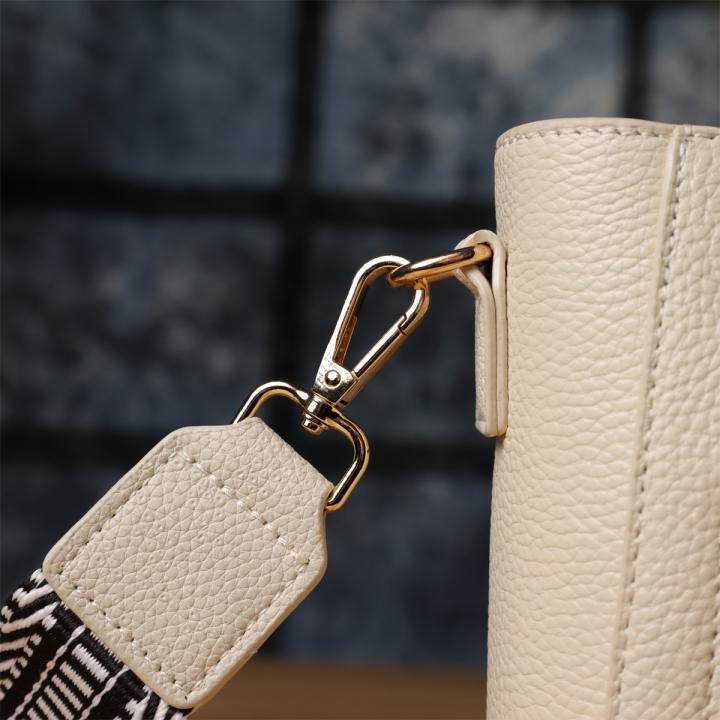 Фурнитура в изысканном золотом цвете прекрасно сочетается с белоснежным тоном кожи, придавая аксессуару утончённый и благородный вид. Съемный текстильный ремешок обеспечивает комфорт при носке — сумку можно носить как на плече, так и через плечо, легко адаптируя её под повседневный или более нарядный образ.
