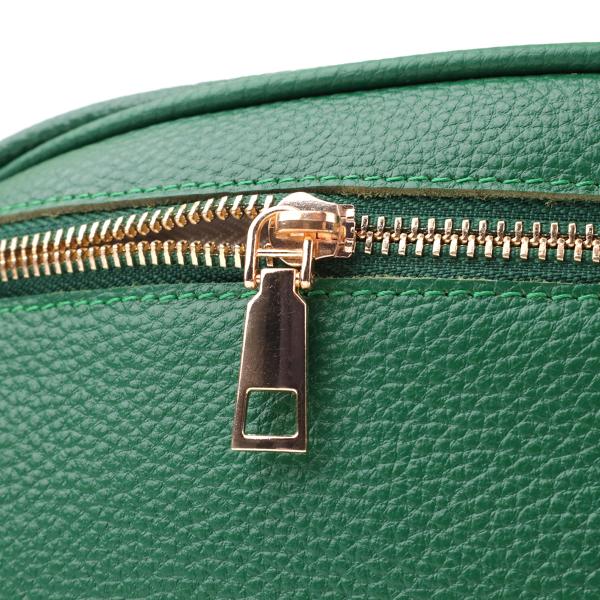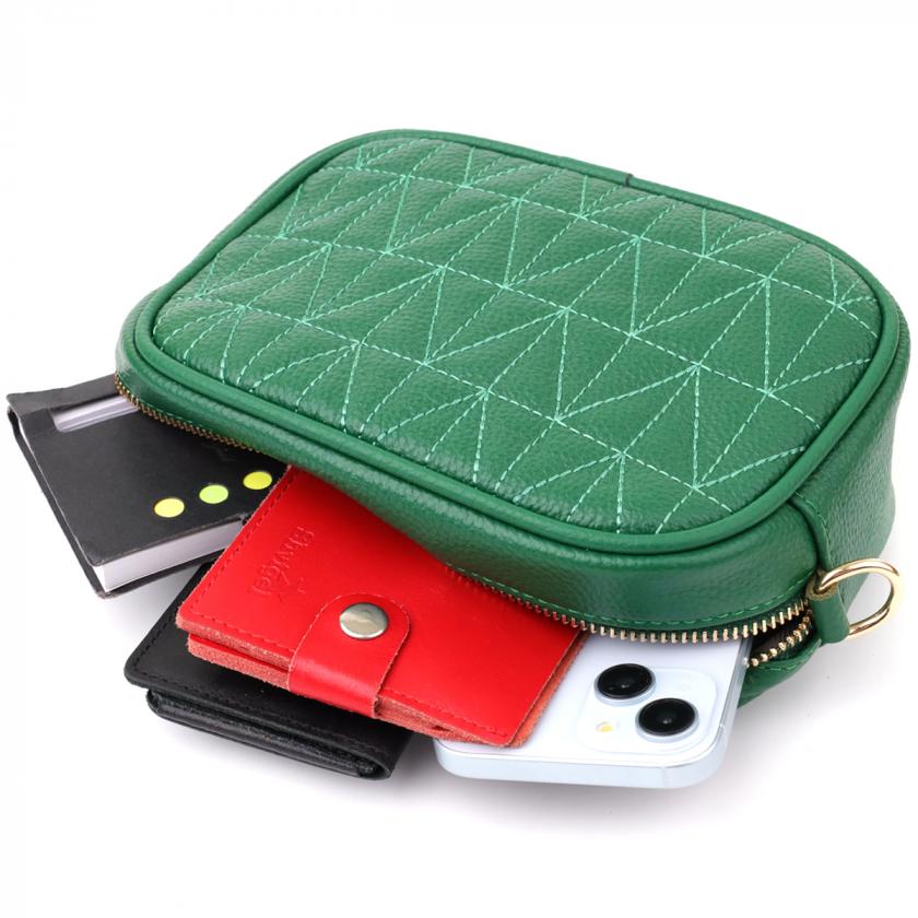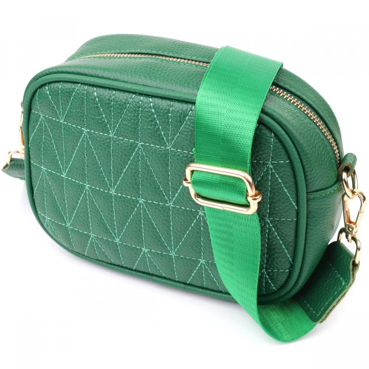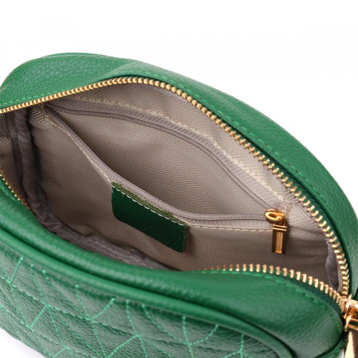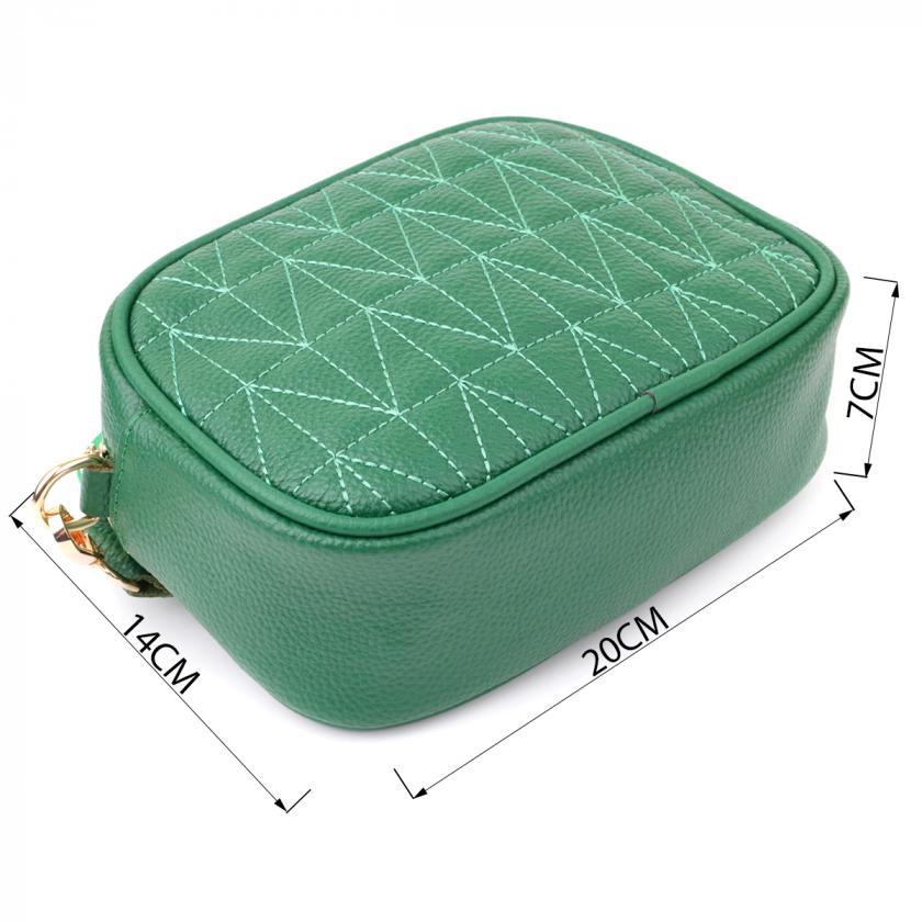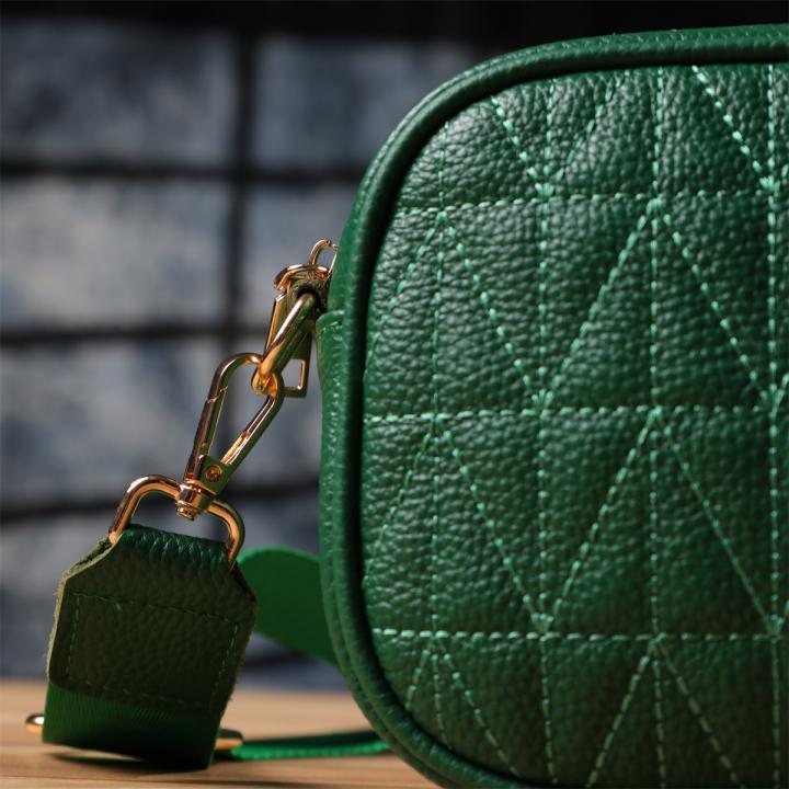 Стильная зеленая стеганая сумка Vintage из натуральной кожи станет стильным дополнением вашего образа, подчеркивая индивидуальность и утонченный вкус. Компактная форма придает модели аккуратный и изысканный вид, а стежка на лицевой стороне делает дизайн более выразительным. Сумка закрывается на молнию, внутри расположено основное отделение с карманом на молнии и открытым карманом для мелочей, а на тыльной стороне находится внешний карман на молнии для удобного доступа к самым нужным вещам. Съемный регулируемый текстильный ремень обеспечивает комфорт при носке, а фурнитура под желтое золото гармонично сочетается с глубоким зеленым оттенком кожи. Такая сумка станет универсальным аксессуаром как для повседневных выходов, так и для особых случаев, добавляя образу элегантности и стиля.