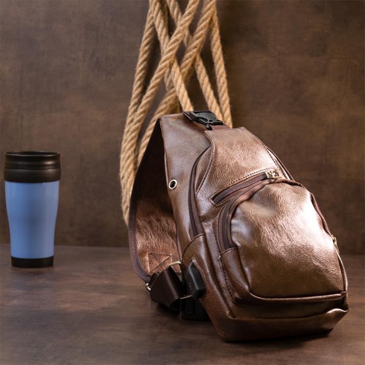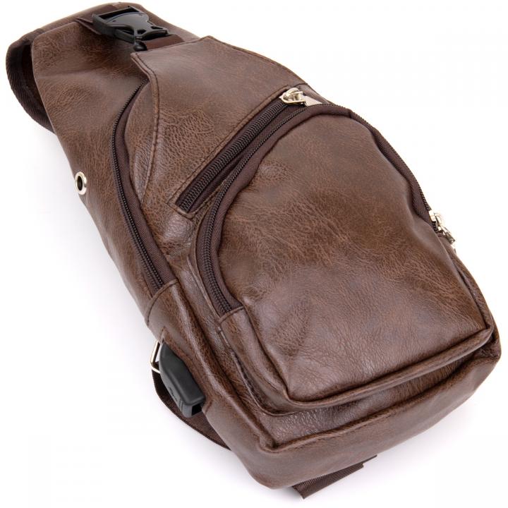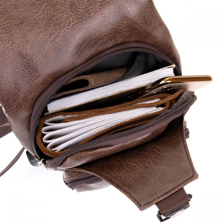 Компактная сумка через плечо из кожзама.Сумка имеет высокое качество исполнения. Благодаря своему компактному размеру сумка идеально разместится у вас под рукой. Особенностью данной модели является то, что все ваши личные вещи у вас под рукой - а руки свободны. Внутри сумки плотная подкладка коричневого цвета. В аксессуаре крепкая фурнитура. Сумка имеет стильный дизайн под современного мужчину. В комплекте к сумке идут шнур для зарядки. В данной модели сбоку имеeтся разъем USB.