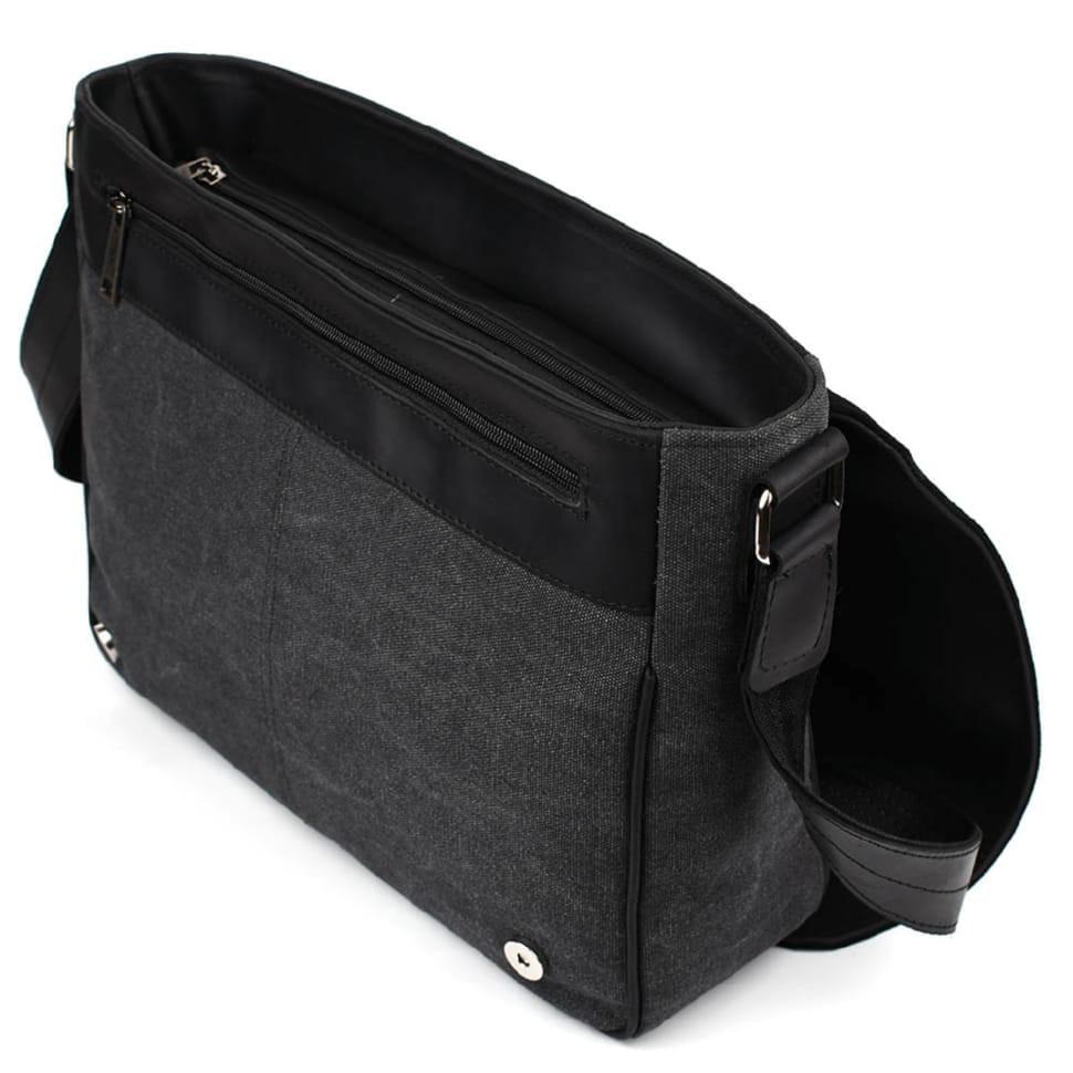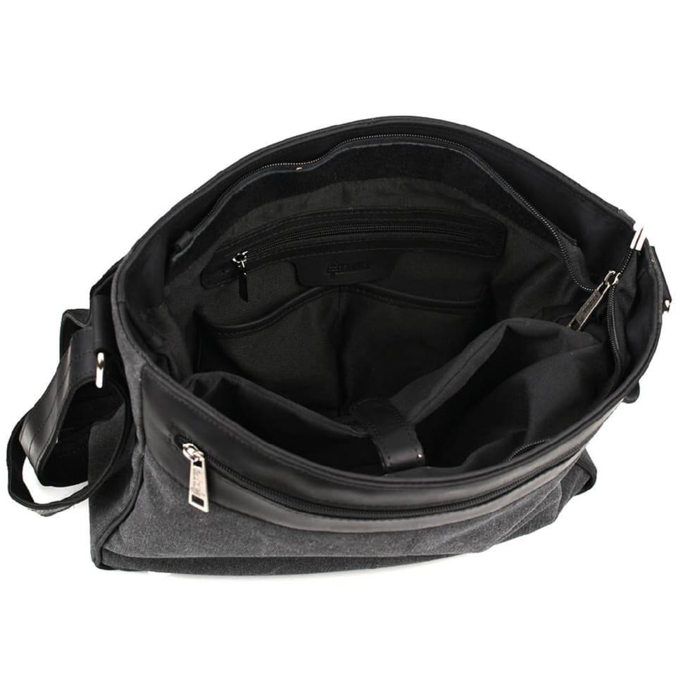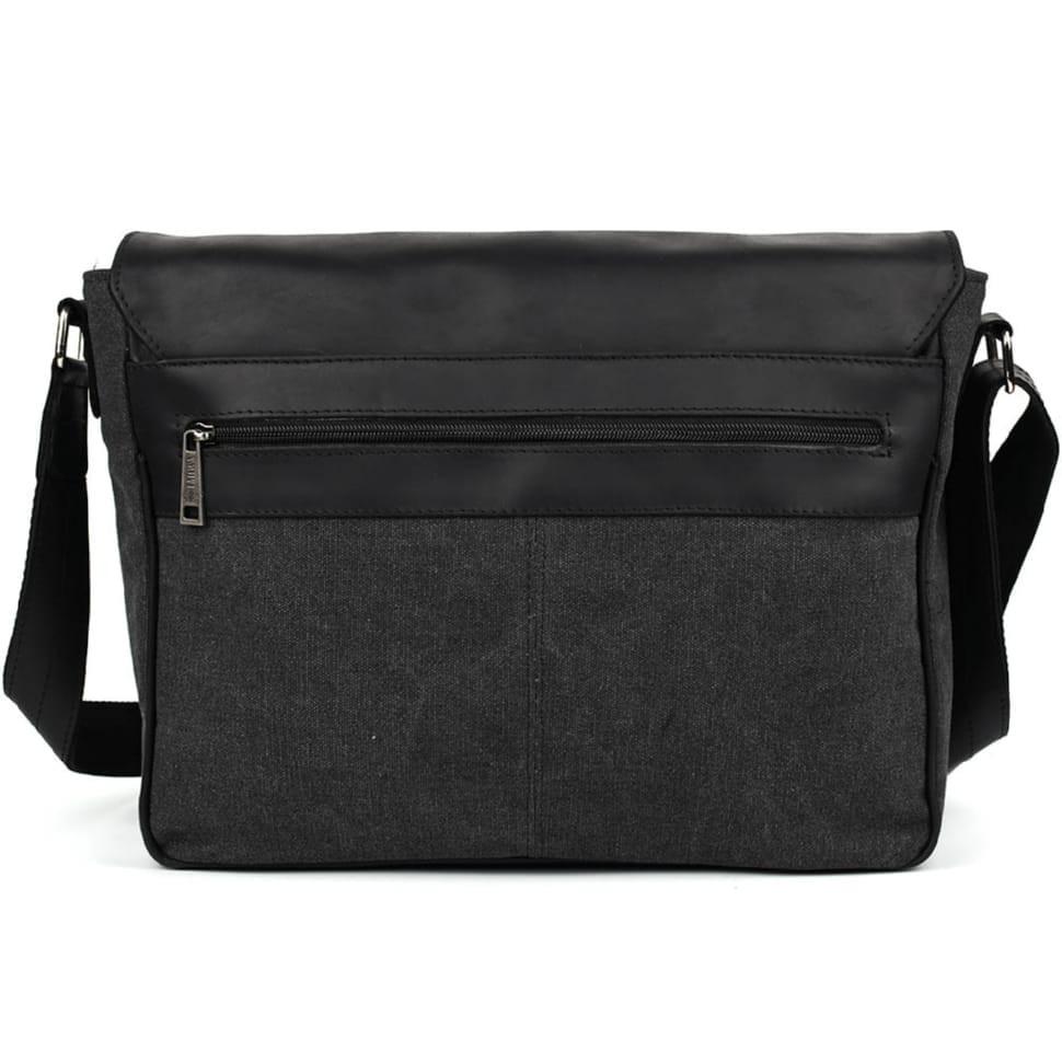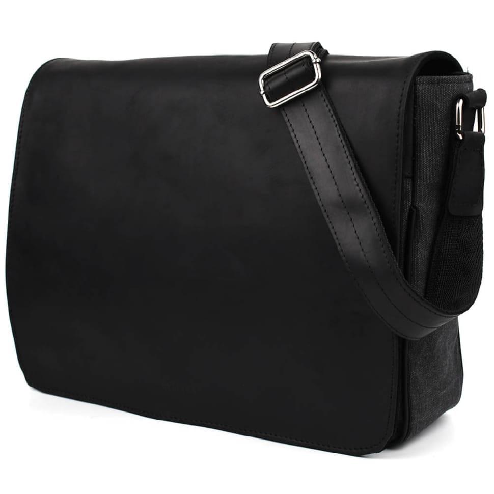 Сумка мужская через плечо из кожи и канвас TARWA RAG-1047-3md - клапан из черной кожи крейзи хорс, корпус сумки из канвас цвета антрацит. В основном отделении может поместиться ноутбук до 14" и документы формата А4. Широкий кожаный наплечный ремень с регулировкой длинны. Под клапаном основное отделение, карман на молнии на передней стороне и открытый карман на всю ширину сумки у основания клапана.