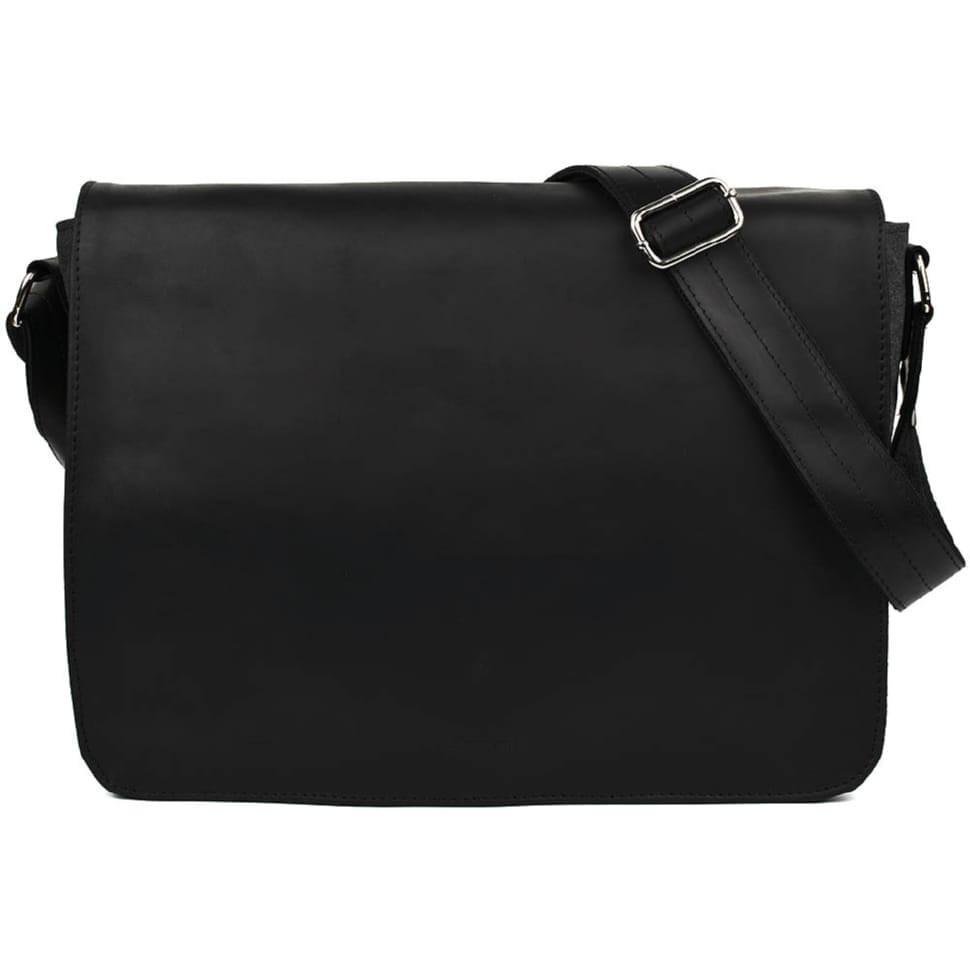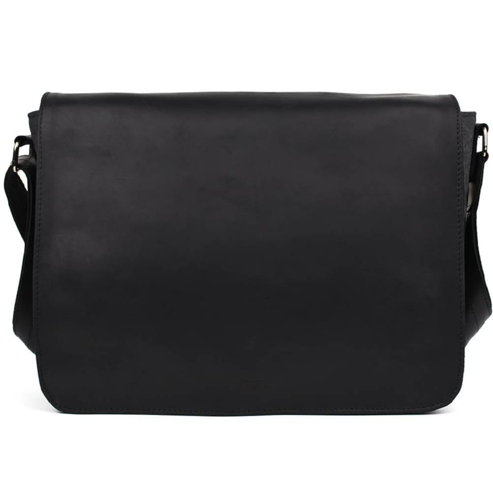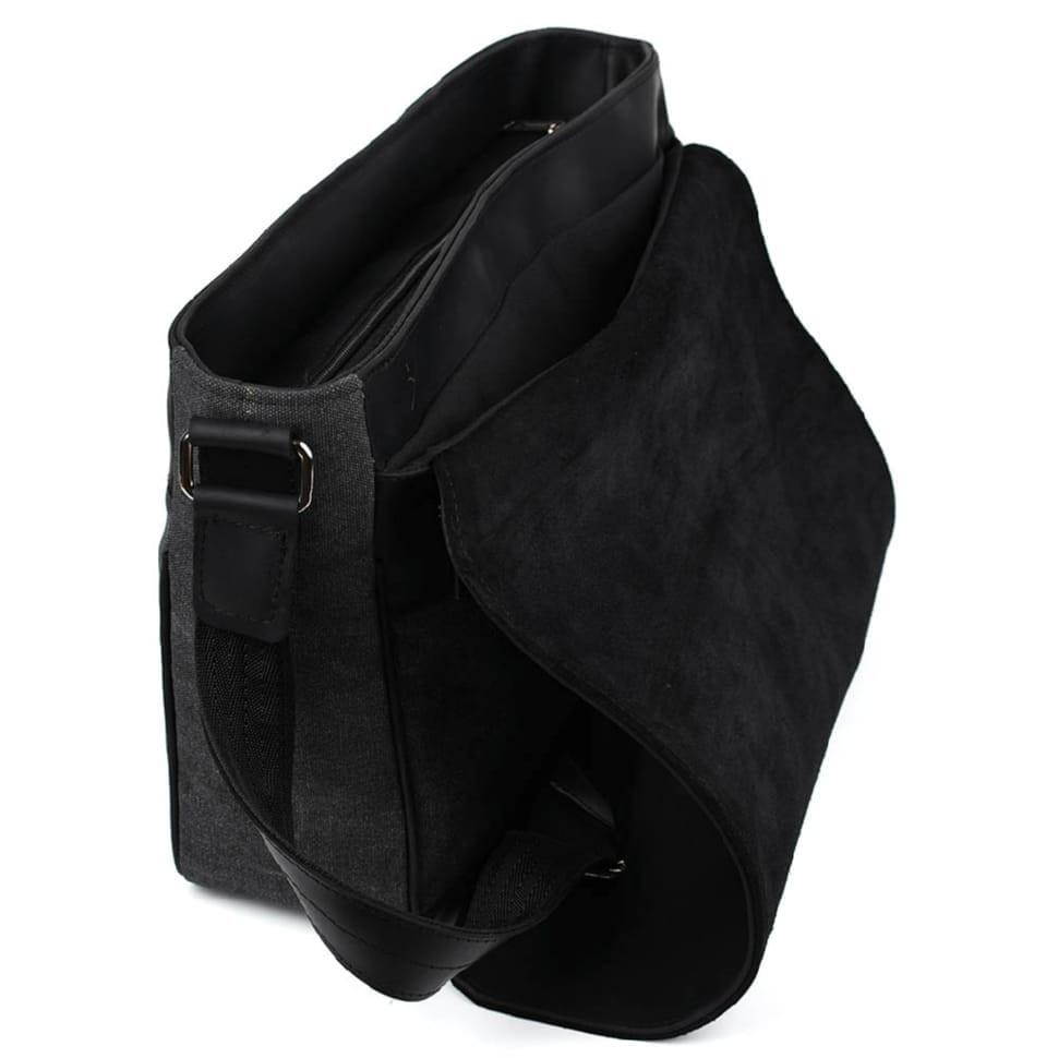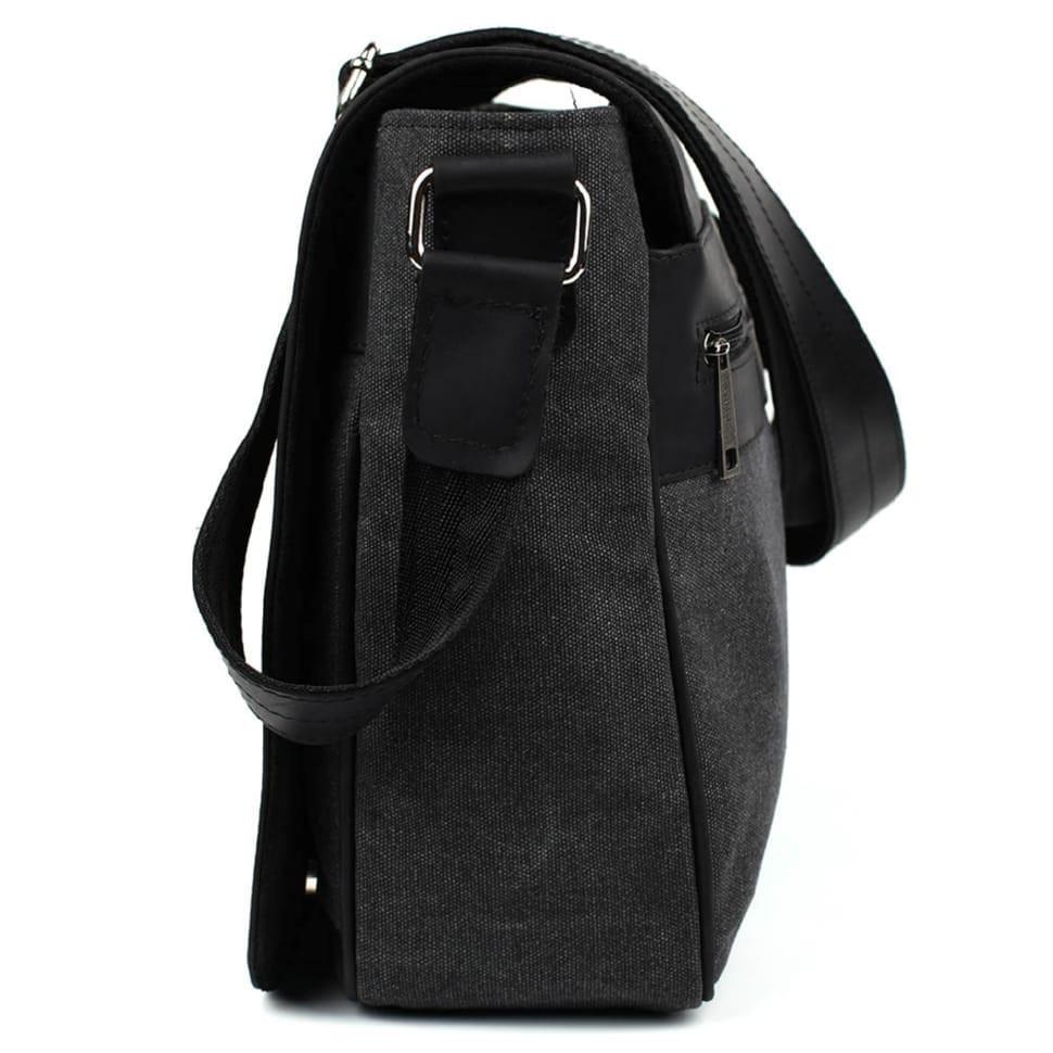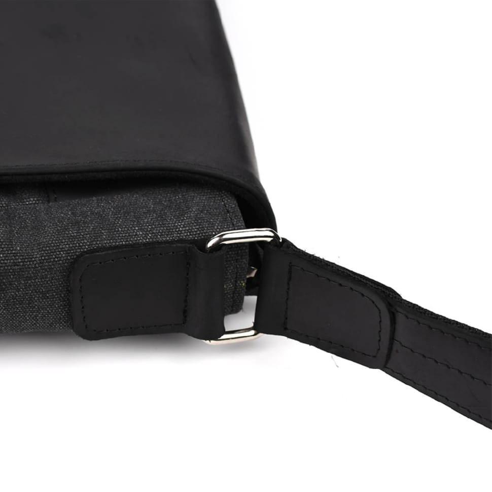 Сумка мужская через плечо из кожи и канвас TARWA RAG-1047-3md - клапан из черной кожи крейзи хорс, корпус сумки из канвас цвета антрацит. В основном отделении может поместиться ноутбук до 14" и документы формата А4. Широкий кожаный наплечный ремень с регулировкой длинны. Под клапаном основное отделение, карман на молнии на передней стороне и открытый карман на всю ширину сумки у основания клапана.
