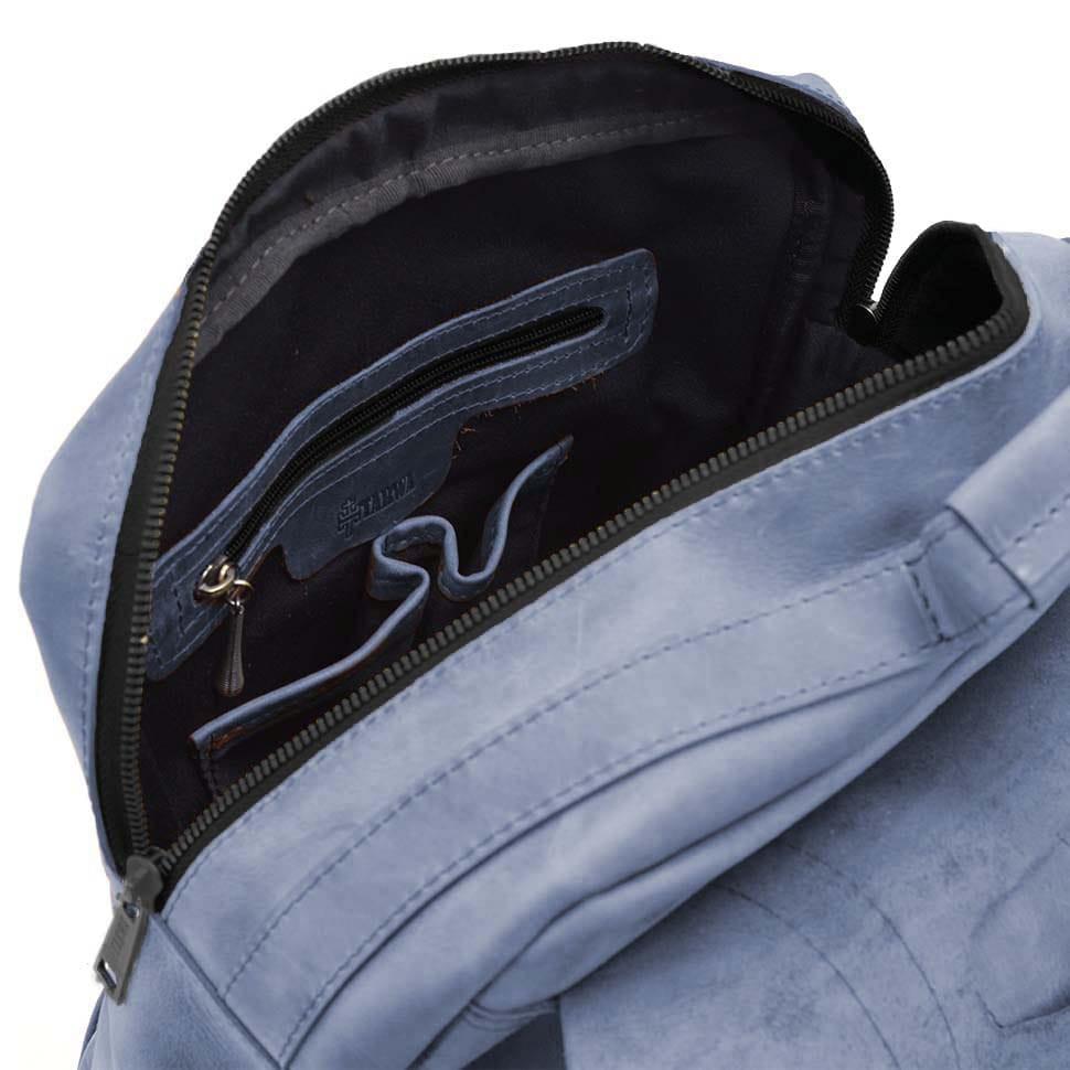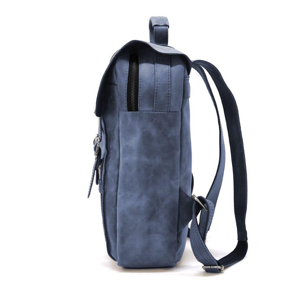 Сумка рюкзак для ноутбука из лошадиной кожи TARWA RK-3420-3md синяя. Закрывается на кожаный клапан на фальш-пряжках - магнитах. Одно отделение на молнии.