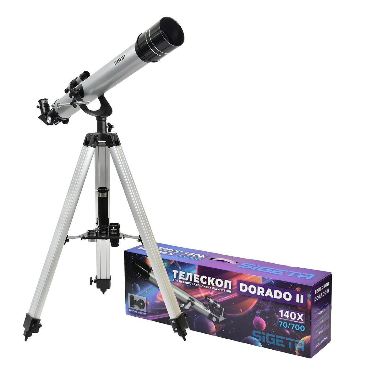 SIGETA Dorado II 70/700 AZ — оновлена версія одного з найпопулярніших телескопів 2024 року (ТОП від OZ.UA), тепер з адаптером для смартфона, а також пізнавальними картами Місяця і планет Сонячної системи. Це легкий та компактний ахроматичний рефрактор початкового рівня, ідеальний у ролі першого телескопа для астрономічних та наземних спостережень. Простий у використанні, він однаково добре підійде дорослим новачкам, які хочуть зробити перші кроки в астрономії, і дітям, для яких стане зручним та наочним інструментом у вивченні зоряного неба. Пристрій постачається в яскравій коробці з космічним дизайном, що робить його чудовим варіантом для оригінального й корисного подарунка.