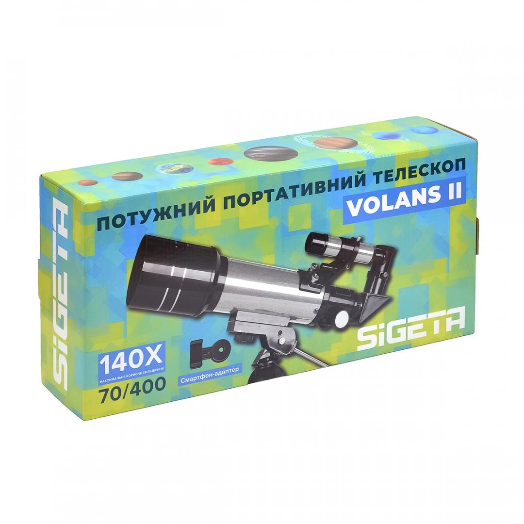 SIGETA Volans II 70/400 AZ — оновлена версія популярного телескопа, що тепер доповнена адаптером для смартфона, а також картами Місяця і планет Сонячної системи. Це легкий і компактний ахроматичний рефрактор початкового рівня, спеціально створений для дітей. Ідеально підходить на роль першого телескопа або підзорної труби. Водночас дана модель може зацікавити й дорослих користувачів, які шукають простий у використанні інструмент для виїзних астрономічних або наземних спостережень. Телескоп постачається в яскравій, барвистій коробці, яка робить його чудовим варіантом для подарунка.