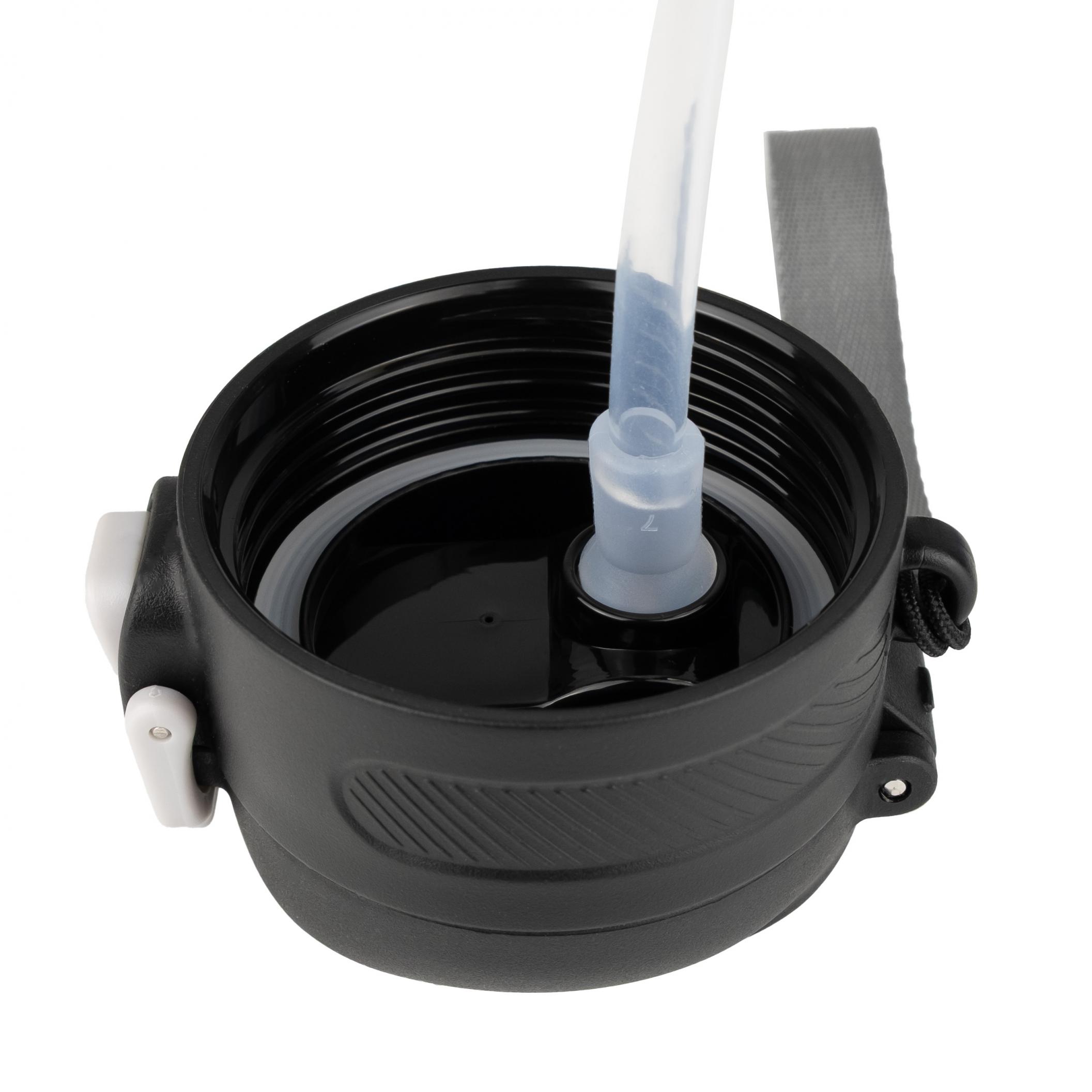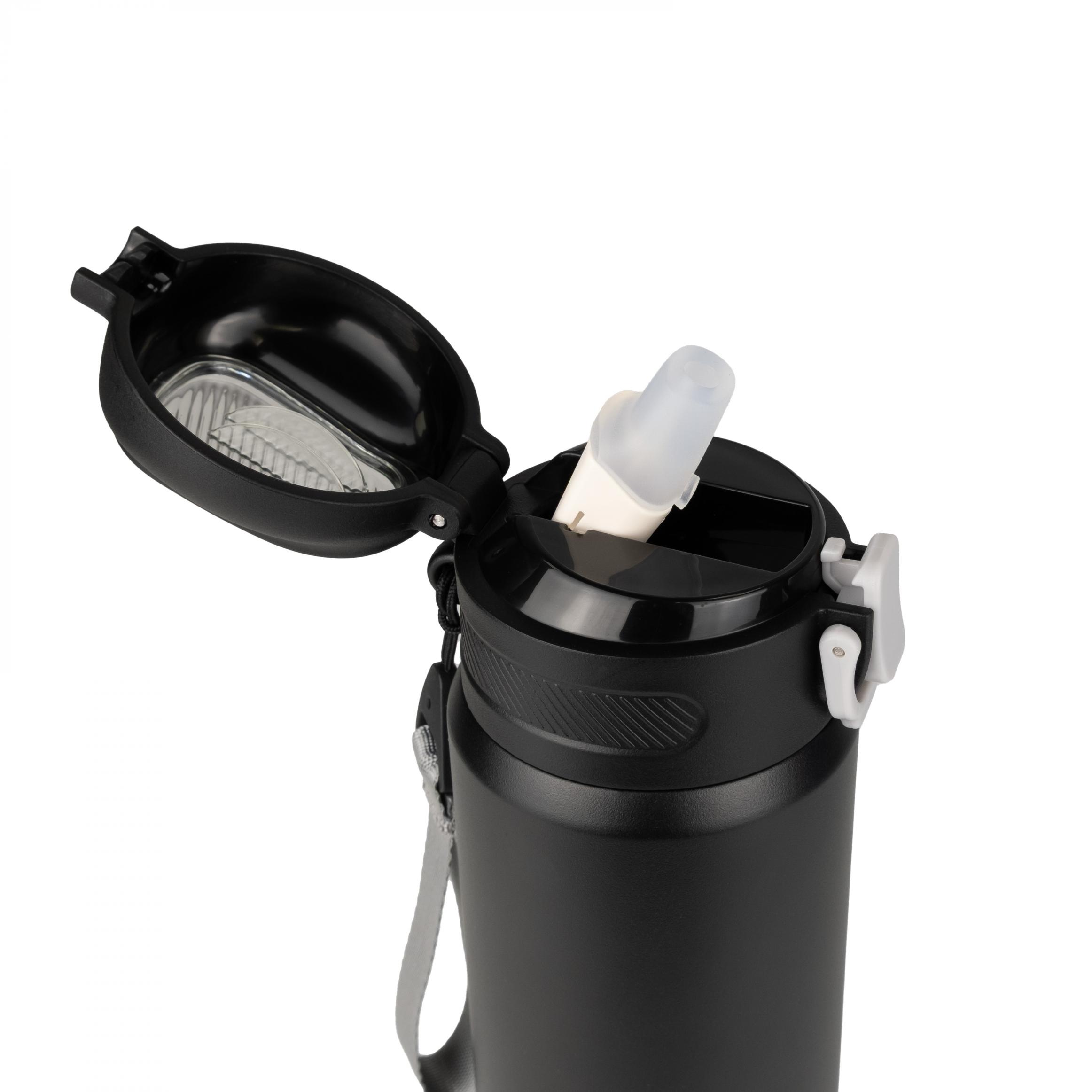 Имеет откидную крышку с фиксатором во избежание случайного проливания. Для удобства оборудована трубочкой для питья. Корпус покрыт износостойкой порошковой краской. Широкое горло колбы облегчает уход за изделием – его легко мыть. В теплое время года благодаря широкому горлу в термокружку можно положить кусочки льда, чтобы напиток как можно дольше хранился холодным.