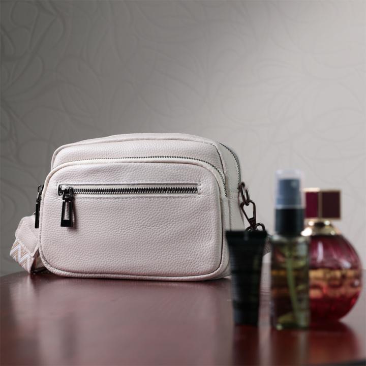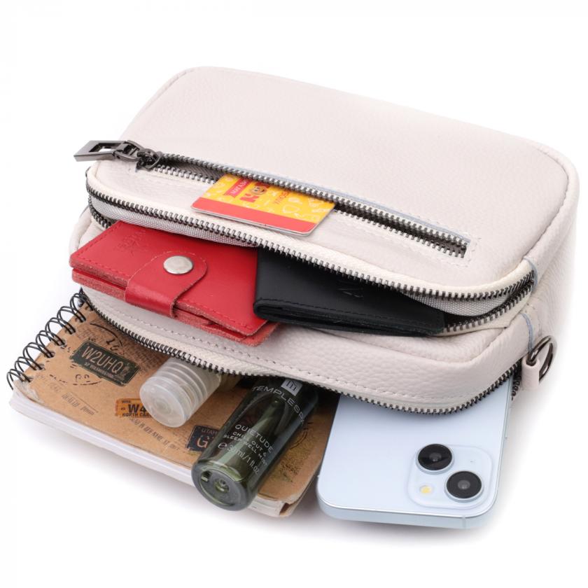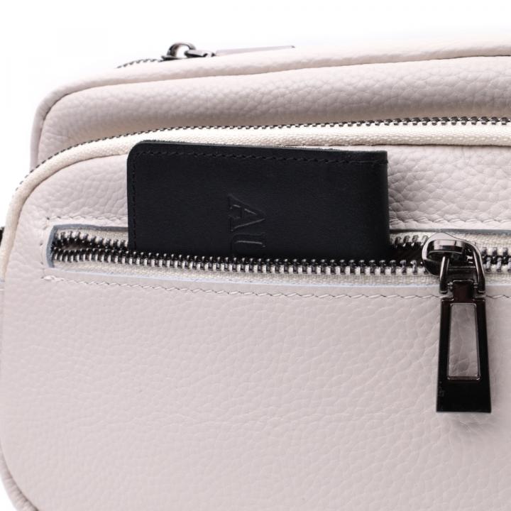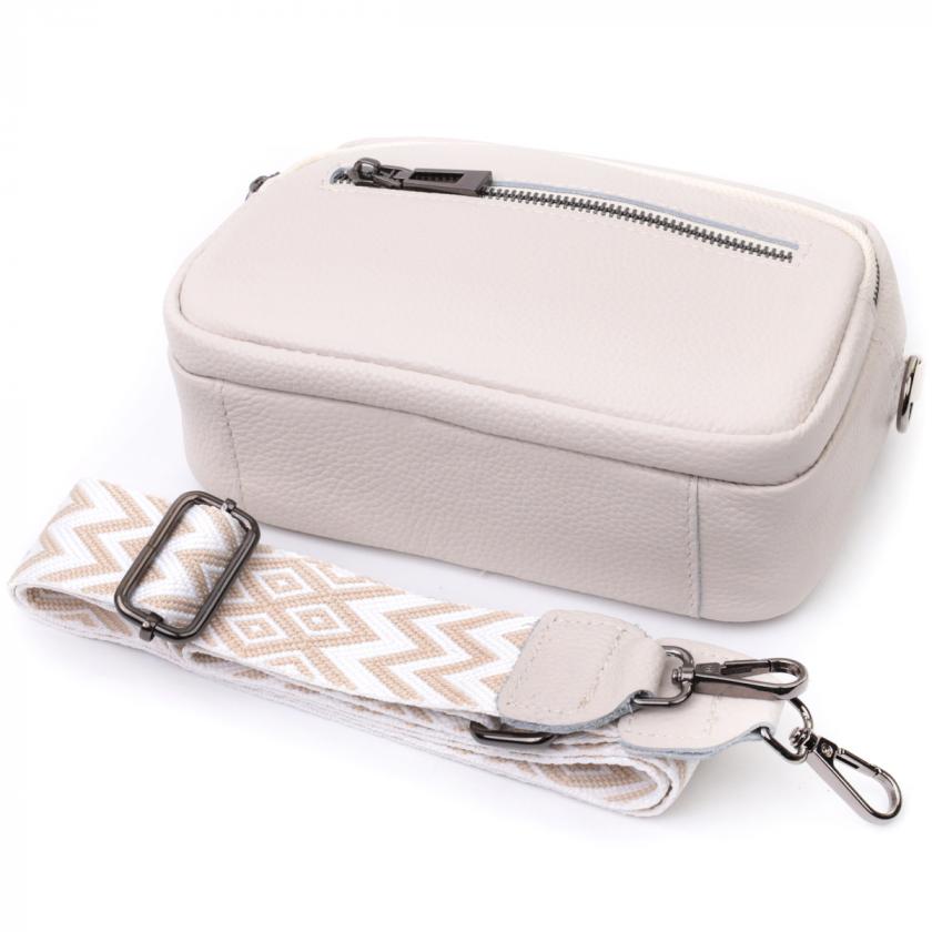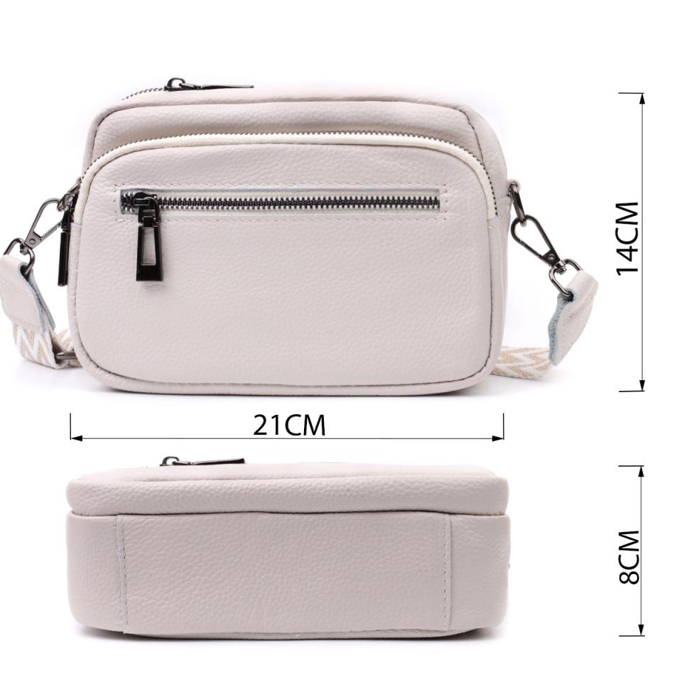 Женская компактная сумка в красивом белом цвете из натуральной кожи. Аксессуар состоит из основного отделения, что закрывается на молнию, кармана открытого типа и кармана на молнии внутри и трех карманов снаружи. Носить сумку можно на плече и через плечо, также можно носить как клатч под рукой, для этого можно снять текстильный ремешок.