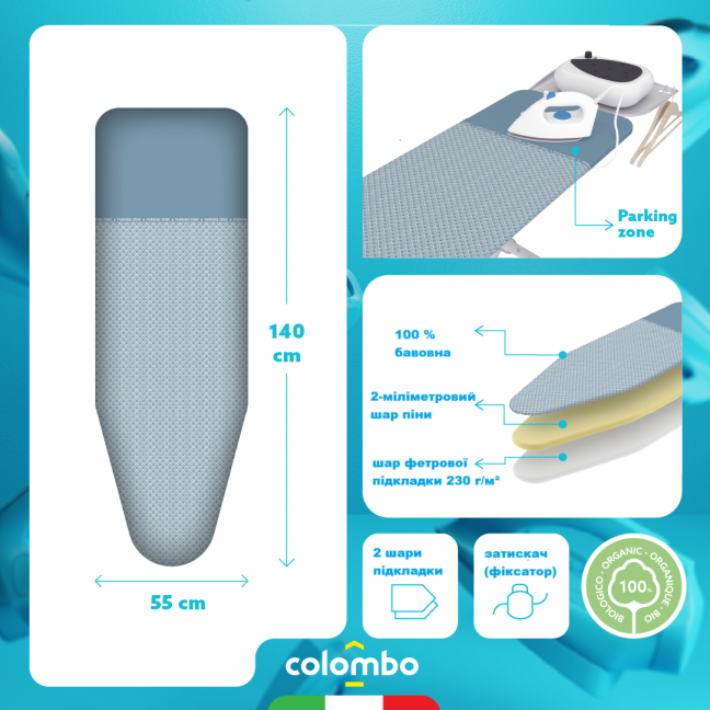 Чохол для прасувальної дошки Colombo Parking Zone (COP830) підходить для більшості стандартних та великих прасувальних дощок. Великий розмір (140 х 55 см) забезпечує повне покриття поверхні для комфортного прасування. Тришарова конструкція для максимального комфорту: поверхня зі 100% органічної бавовни, шар піни товщиною 20 мм та м'яка повстяна підкладка 200г/м2 для більш плавного прасування. Термостійка зона: включає безпечну зону паркування, де можна залишити гарячу праску, не пошкоджуючи дошку.