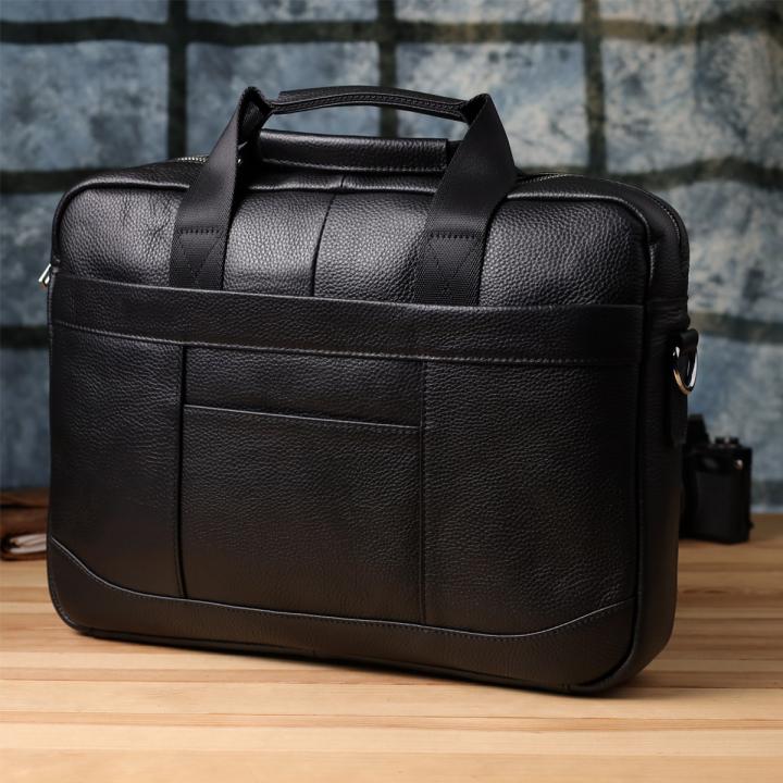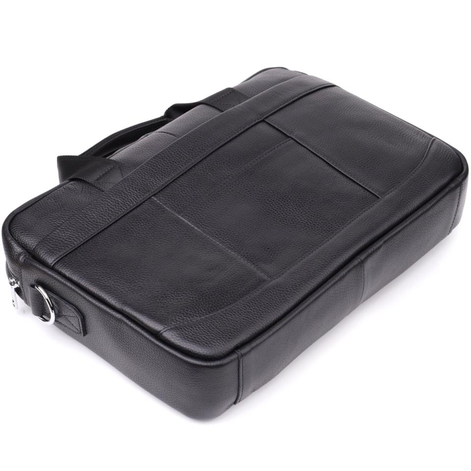 Стильный и функциональный кожаный портфель черного цвета, выполненный из натуральной кожи с прочным каркасом, идеально подойдет для деловых людей, ценящих комфорт и порядок. Сумка надежно сохраняет форму и обеспечивает защиту содержимого, включая ноутбук до 15 дюймов и документы формата А4.