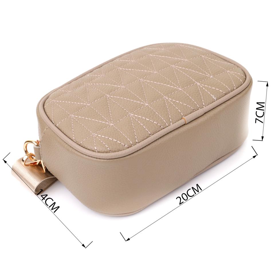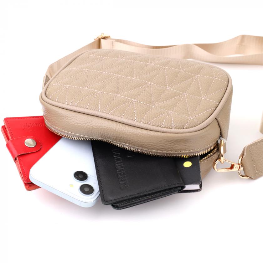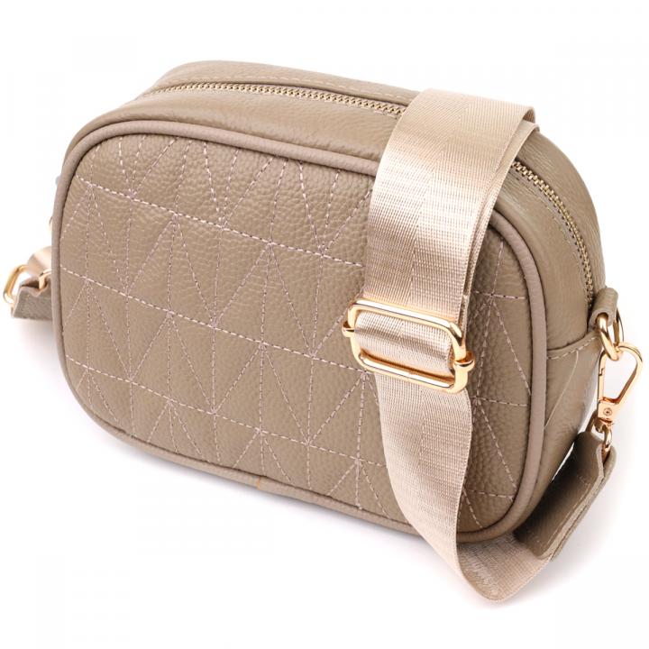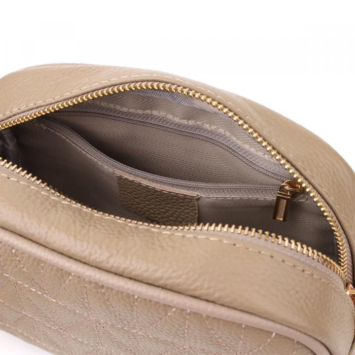 Красивая бежевая стеганая сумка Vintage из натуральной кожи станет стильным и универсальным аксессуаром. Мягкая, но при этом плотная кожа подчеркивает высокое качество изделия и делает сумку особенно приятной на ощупь. Компактная форма придает модели аккуратный и изысканный вид, а стежка на лицевой стороне добавляет дизайнерский шарм. Сумка закрывается на молнию, внутри расположено основное отделение с карманом на молнии и открытым карманом для мелочей, а на тыльной стороне находится внешний карман на молнии для удобного хранения необходимых вещей. Съемный регулируемый текстильный ремень обеспечивает комфорт при носке, а фурнитура под желтое золото стильно оттеняет теплый бежевый цвет кожи. Эта сумка станет идеальным спутником как для повседневных образов, так и для особых случаев, подчеркивая утонченный вкус и любовь к качественным материалам.