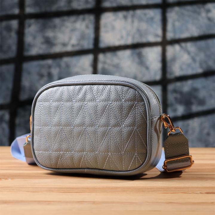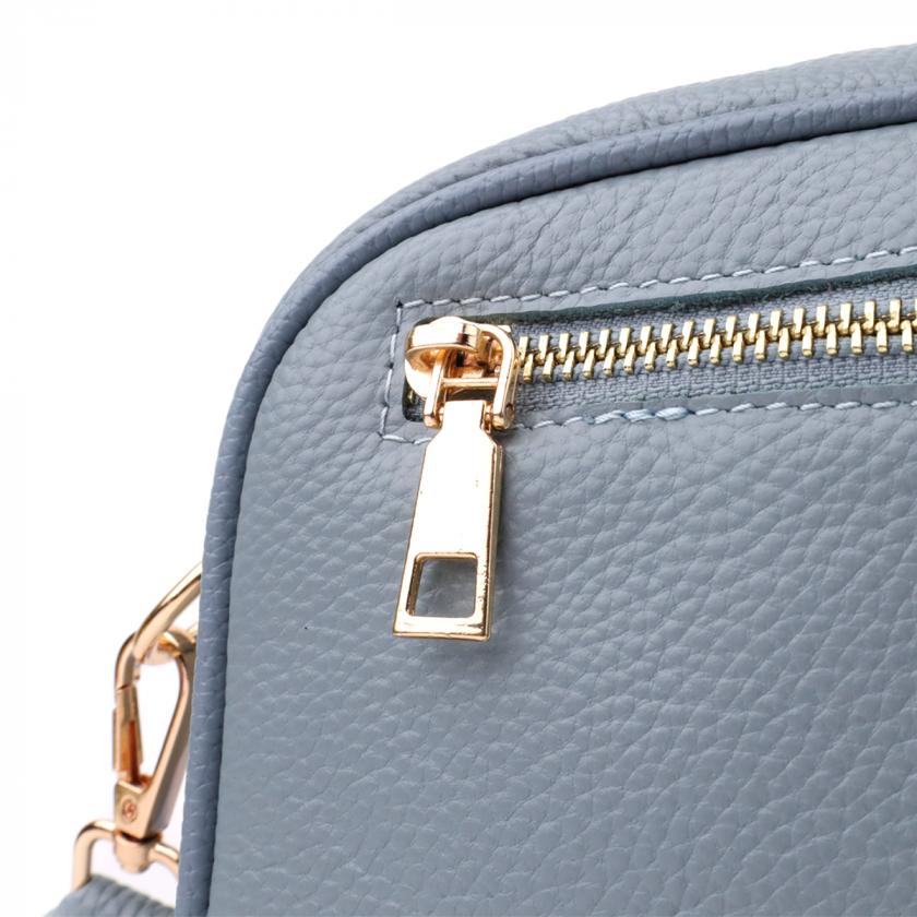Утонченная стеганая сумка Vintage в серо-голубом цвете из натуральной кожи станет стильным и необычным аксессуаром, добавляя свежести и легкости образу. Плотная и качественная кожа делает сумку приятной на ощупь и подчеркивает высокий уровень исполнения. Компактная форма придает аккуратный и современный вид, а стежка на лицевой стороне добавляет дизайнерский шарм. Сумка закрывается на молнию, внутри расположено основное отделение с карманом на молнии и открытым карманом для мелочей, а на тыльной стороне находится внешний карман на молнии для удобного хранения самых необходимых вещей. Съемный регулируемый текстильный ремень обеспечивает комфорт при носке, а фурнитура под желтое золото гармонично оттеняет холодный серо-голубой тон кожи. Эта сумка станет универсальным аксессуаром для повседневных образов и особых случаев, подчеркивая утонченный вкус и любовь к качественным материалам.
