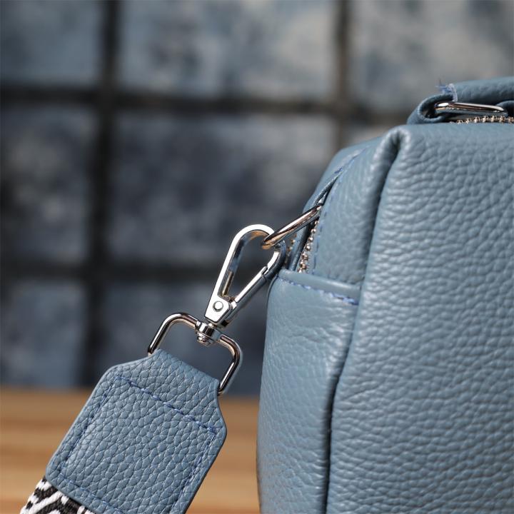 Для защиты дна от износа и загрязнений предусмотрены металлические ножки, а фурнитура цвета серебра подчеркивает утонченность и свежесть голубого оттенка. Дополнением служит съемный текстильный ремень, который регулируется по длине и позволяет носить сумку на плече или через плечо в зависимости от ситуации.