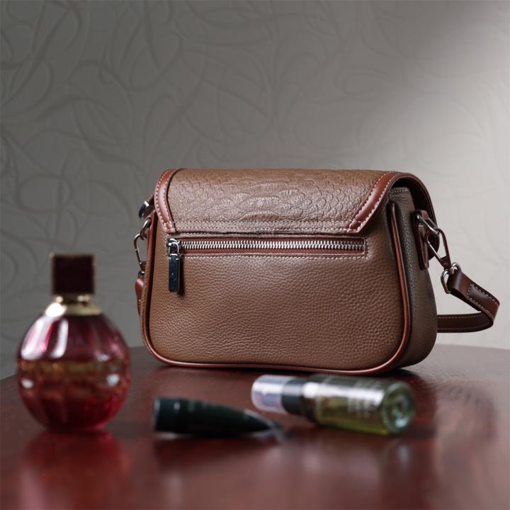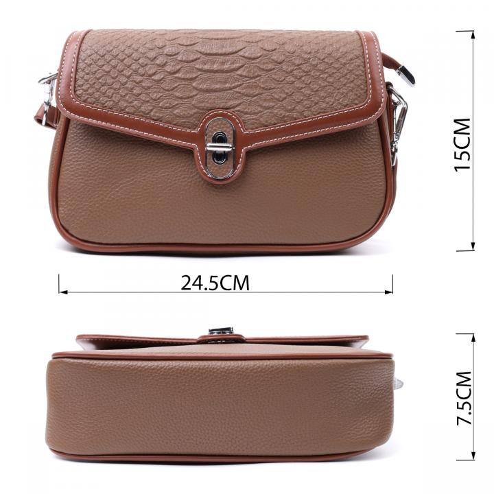 Удобная каркасная женская сумка из натуральной кожи. В изделии использована кожа коричневого цвета. Притягивает взгляд в изделии фактурный клапан с тиснением под змею и изящная механическая защелка. Аксессуар состоит из