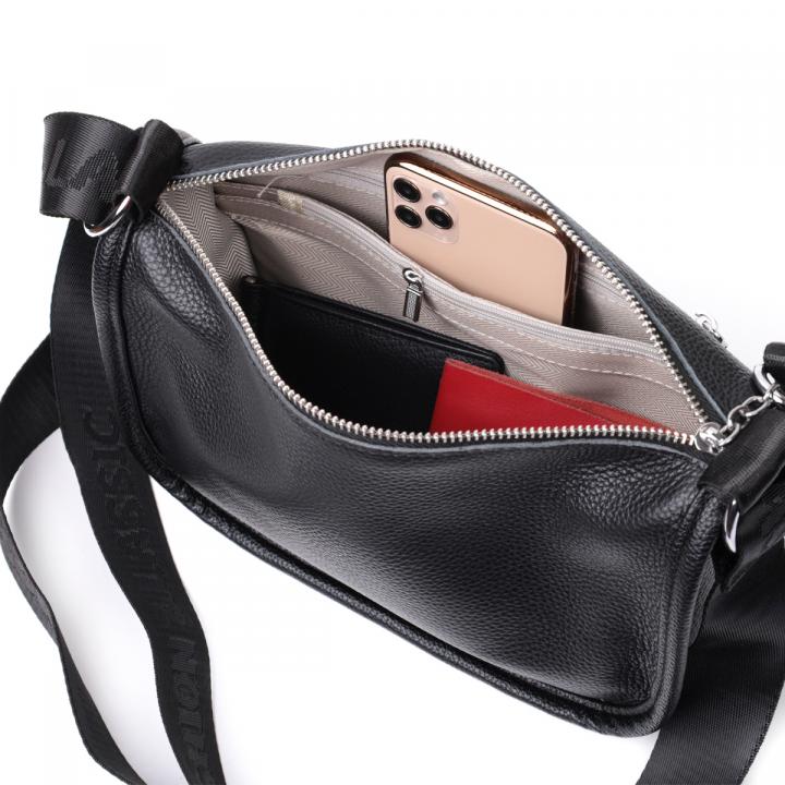Женская полукруглая сумка из натуральной кожи с высоким показателем качества и износостойкости. Аксессуар состоит из основного отделения, что закрывается на молнию, внутри которого находится потайной карман на молнии и карман открытого типа, а также карман на молнии на тыльной стороне снаружи. Носить сумку можно на плече, для этого имеется несъемный регулируемый текстильный ремень. В изделии использована качественная фурнитура серебряного цвета.