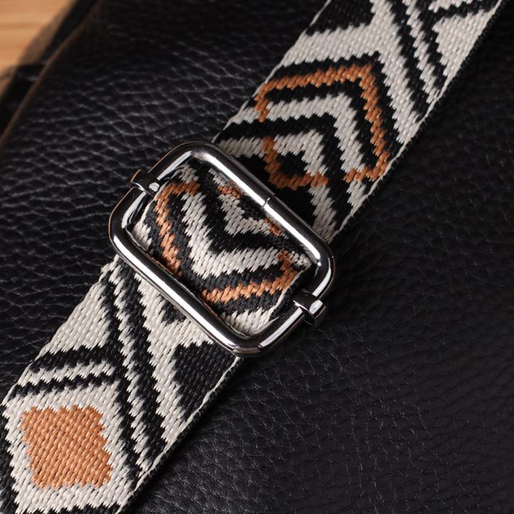 Особое внимание заслуживает регулируемый текстильный ремень с ярким стильным узором — он не только обеспечивает комфортную посадку на теле, но и становится выразительным элементом дизайна. Ремень несъёмный, но легко регулируется под ваш рост и способ ношения. Фурнитура выполнена в серебристом цвете, что придаёт аксессуару современный и сдержанный блеск, прекрасно сочетающийся с текстурой кожи и акцентами ремня.