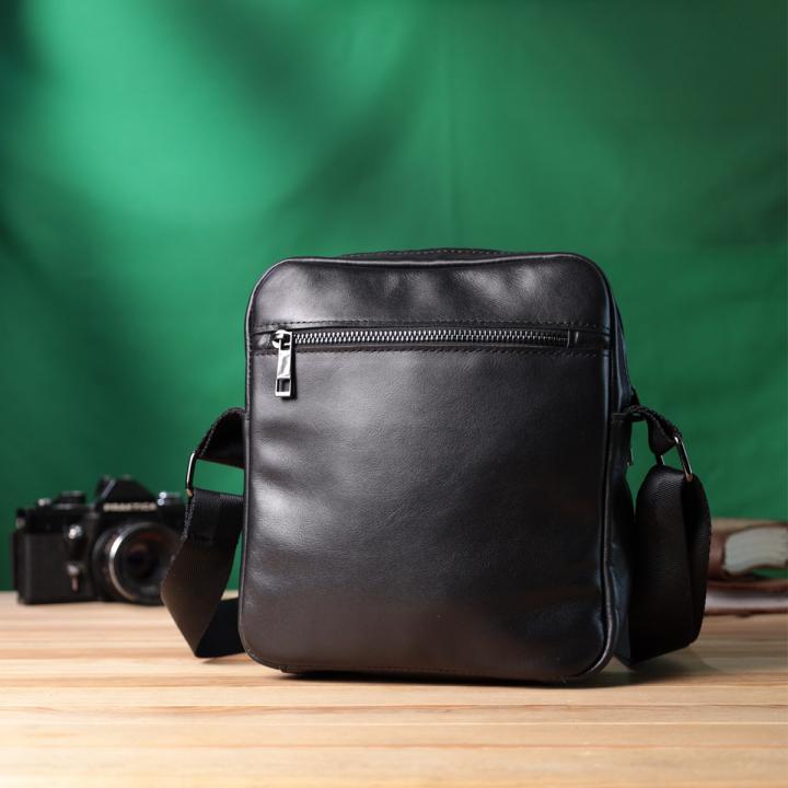 Интересная мужская сумка мессенджер, с большим количеством карманов, в которую поместятся все ваши необходимые вещи и даже мини айпад. Великолепная мужская сумка вертикального формата, изготовленная из натуральной гладкой кожи черного цвета. Фурнитура металлического цвета - стойкая не меняет свой цвет в процессе носки. Аксессуар отлично сочетается со всеми стилями в одежде и может стать отличным подарком на любой праздник.