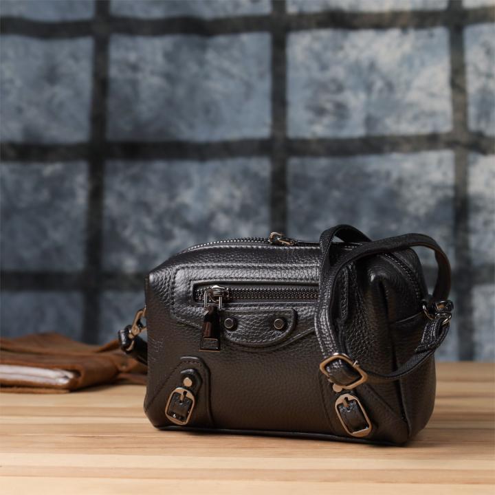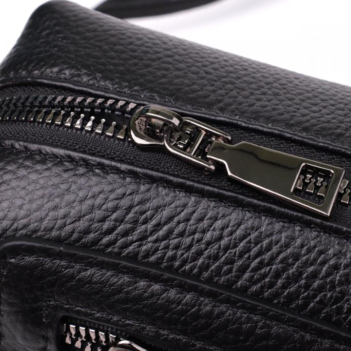 Небольшая женская кожаная сумка с декоративными элементами — стильная деталь для смелого образа. Эта компактная модель сразу привлекает внимание за счёт эффектного дизайна: черная натуральная кожа дополнена выразительными металлическими элементами, декоративной строчкой и акцентной фурнитурой. Стильный внешний карман на молнии обрамлен заклёпками и декоративными ремешками, придавая аксессуару лёгкую брутальность и характер.