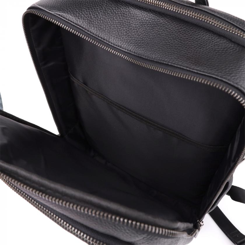 На лицевой стороне расположены накладной карман с двойной молнией и встроенный вертикальный карман на молнии, которые помогут организовать мелкие предметы. Для удобства переноски предусмотрены две кожаные ручки — одна сверху, другая сбоку, позволяющие брать рюкзак как в руки, так и носить на плече.