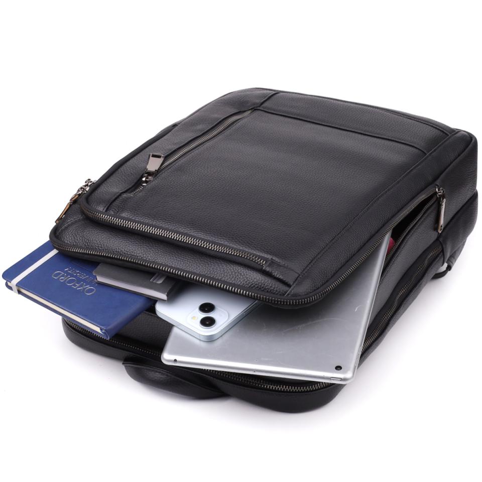 Мужской кожаный рюкзак выполнен из качественной натуральной кожи и сочетает стиль с максимальным удобством. Модель оснащена двумя основными отделениями на молниях с двойными бегунками, что обеспечивает быстрый доступ и удобное разделение содержимого.