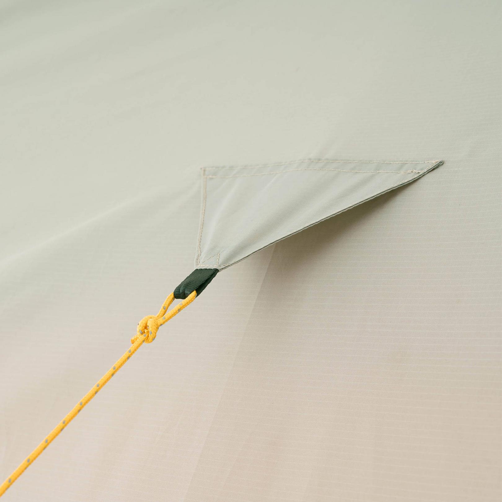 - У місцях застосування найбільшого зусилля тент має накладки з більш міцної тканини зі структурою Ripstop, що особливо важливо для тентів з поліуретановим покриттям. Накладки мають трикутну форму, завдяки чому рівномірно розподіляють прикладені зусилля по всій площі тенту.