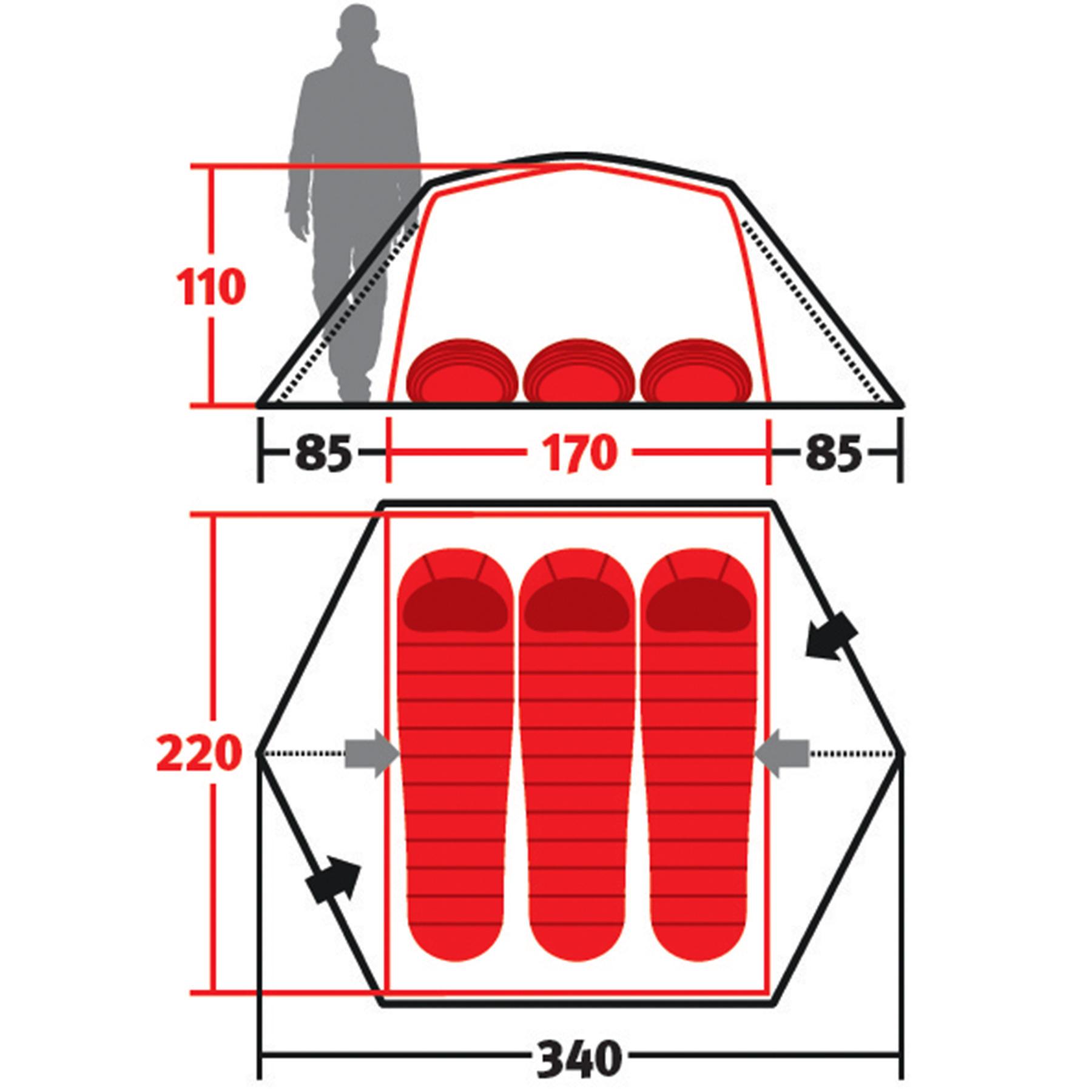 - Зовнішній намет (Д х Ш х В): 220 х 340 х 110 см