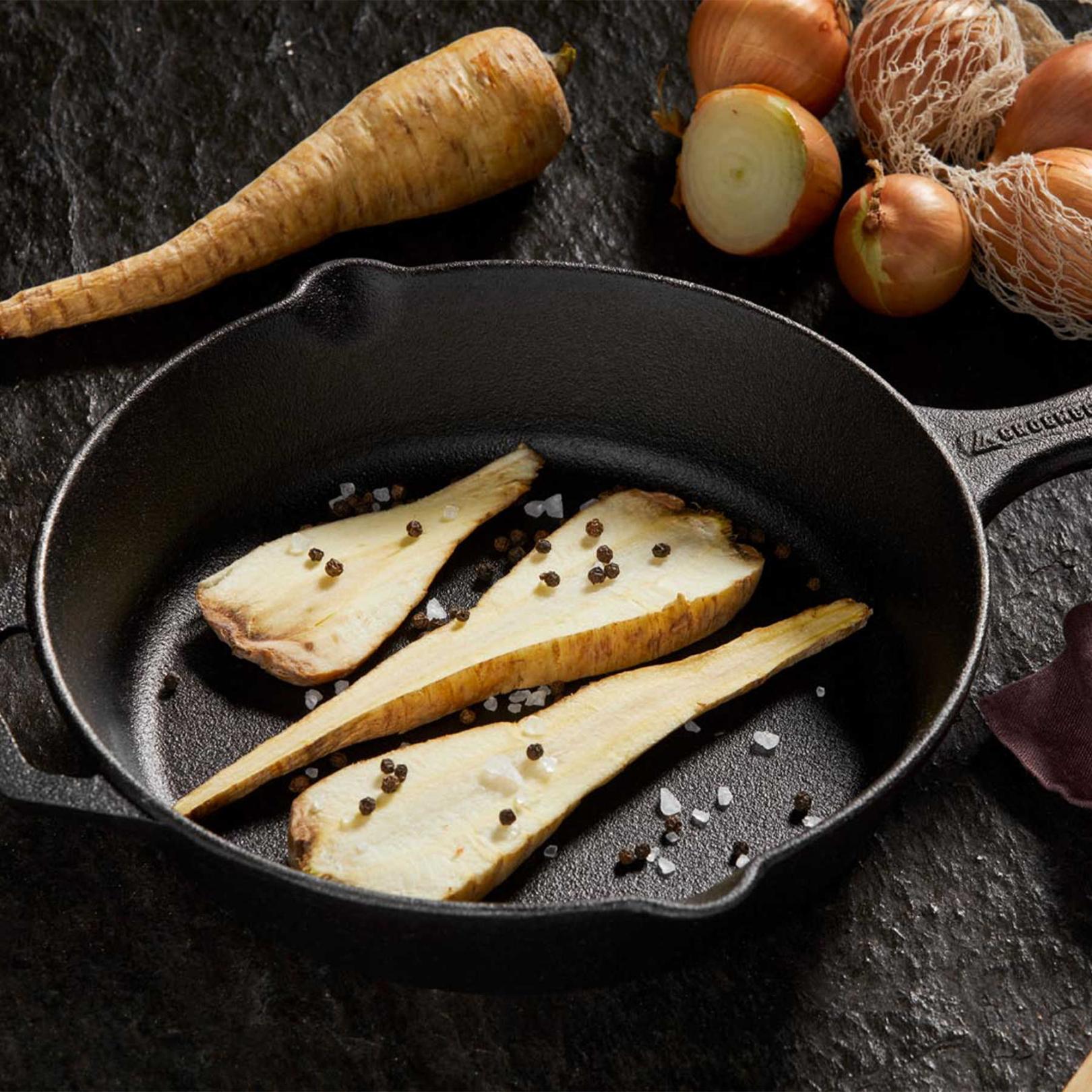 Перед першим використанням сковороду слід промити з милом і губкою, висушити, натерти соняшниковою олією і запекти при температурі 200°C близько години. Після цього формується природне антипригарне покриття - патина. У подальшому мити лише теплою водою без миючих засобів. Після миття - ретельно висушити і змастити олією.