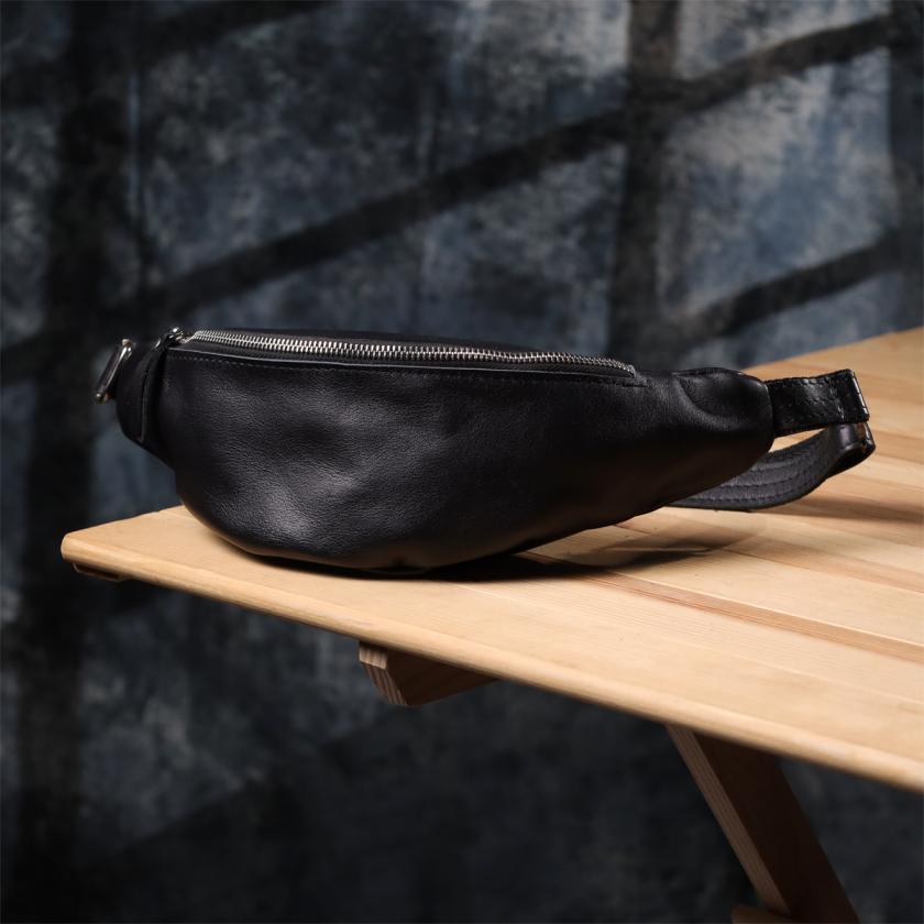 Мужская сумка-бананка от украинского бренда Shvigel — удачное сочетание практичности, стиля и индивидуальности. Выполненная из прочной натуральной гладкой кожи в классическом черном цвете, который придаёт аксессуару свежесть и благородство, подчёркивая вашу оригинальность и уверенность в себе.