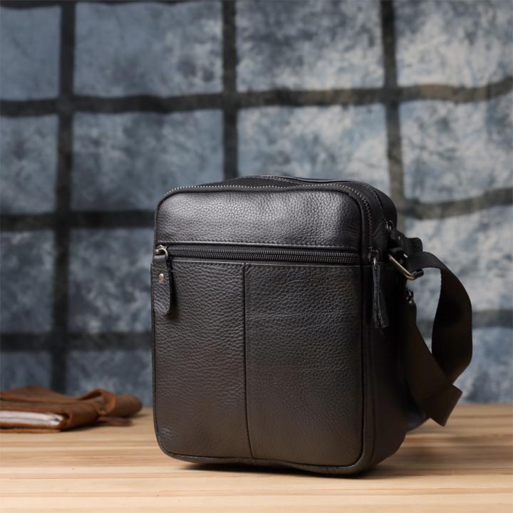 Мужская кожаная сумка через плечо выполнена из натуральной кожи, которая отличается практичностью и функциональностью. Сумка имеет два основных отделения на молниях внутри которых потайной карман и накладной кармашек на молнии. На лицевой стороне предусмотрен горизонтальный встроенный карман на молнии и дополнительный накладной карман. С тыльной стороны — ещё один карман на молнии.