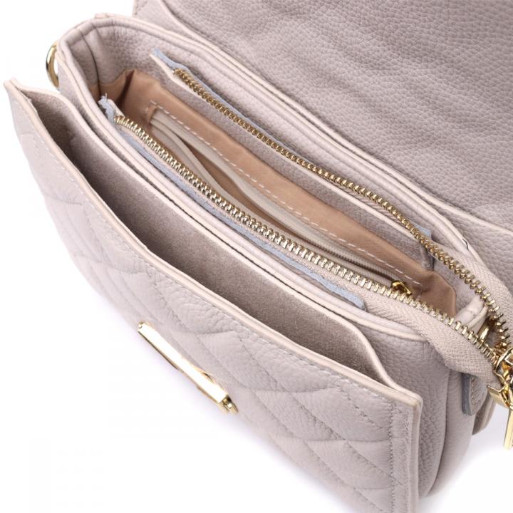Стильная вечерняя сумка для женщин из натуральной кожи флотар, которая неприхотлива в уходе и долго носится. Изделие полностью прошито стильными ромбами которые никогда не выходят из моды. Аксессуар состоит из основного отделения, кармана открытого типа и потайного кармана на молнии внутри, а также четырех карманов под клапаном. Носить сумку можно в руке, под рукой, на плече и через плечо, для этого имеется кожаный съемный ремень. В аксессуаре использована качественная фурнитура цвета желтого золота. Универсальный вариант сумки на вечер и на каждий день.