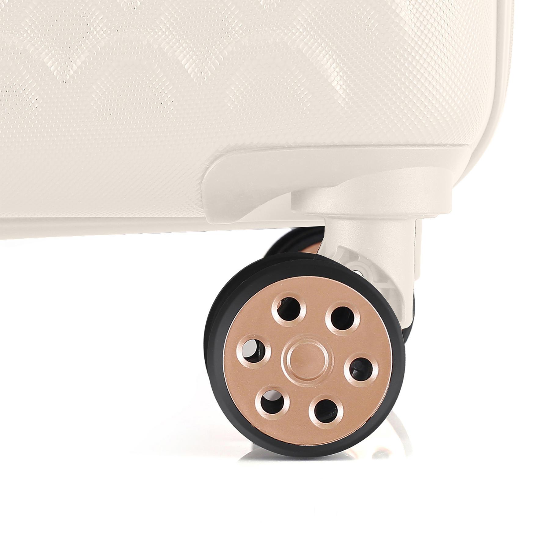 - Повноповоротні колеса - дана модель оснащена чотирма обертовими на 360 ° здвоєними колесами. Здвоєні колеса забезпечують кращий розподіл ваги та стійкість валізи, відмінне зчеплення, маневреність та мають більшу зносостійкість. Колеса кріпляться на 4 гвинти зсередини, що забезпечує високу стійкість при ударному навантаженні з будь-якого боку і дозволяє їх замінити у разі зносу.