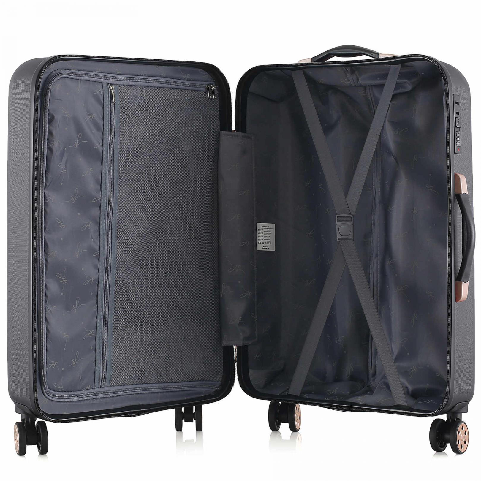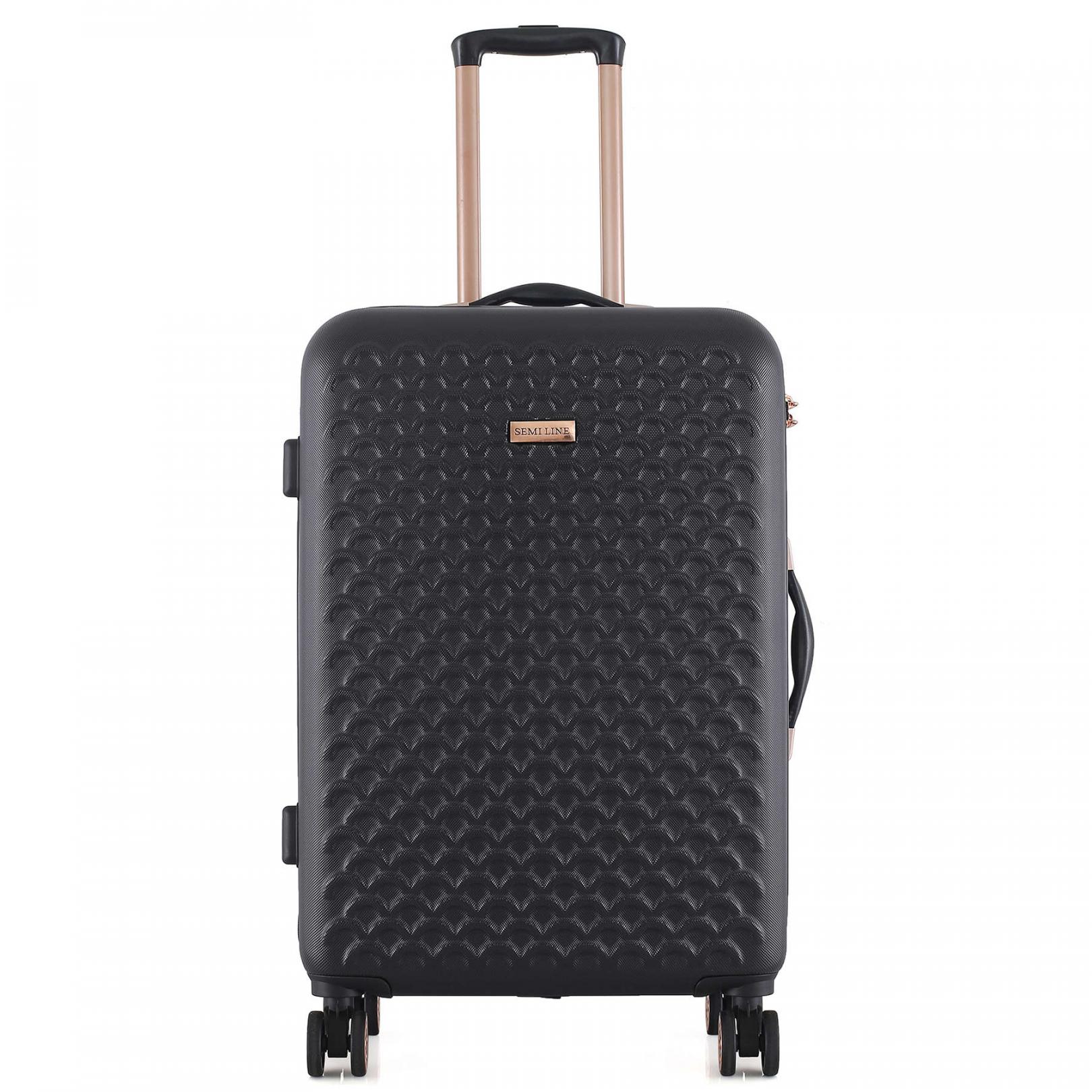 Чорна валіза Semi Line T5718 з численними металевими і пластиковими вставками під золото і хвилястим візерунком фасаду виглядає достатньо вишукано. Вона оснащена легкою алюмінієвою телескопічною ручкою, що фіксується в трьох положеннях, а ручки для перенесення валізи в руках виконані з приємного на дотик пластику Soft-Touch. "Утоплений" кодовий замок покликаний захистити вміст вашої валізи, а також не виступає над корпусом, отже його неможливо випадково пошкодити при транспортуванні валізи.