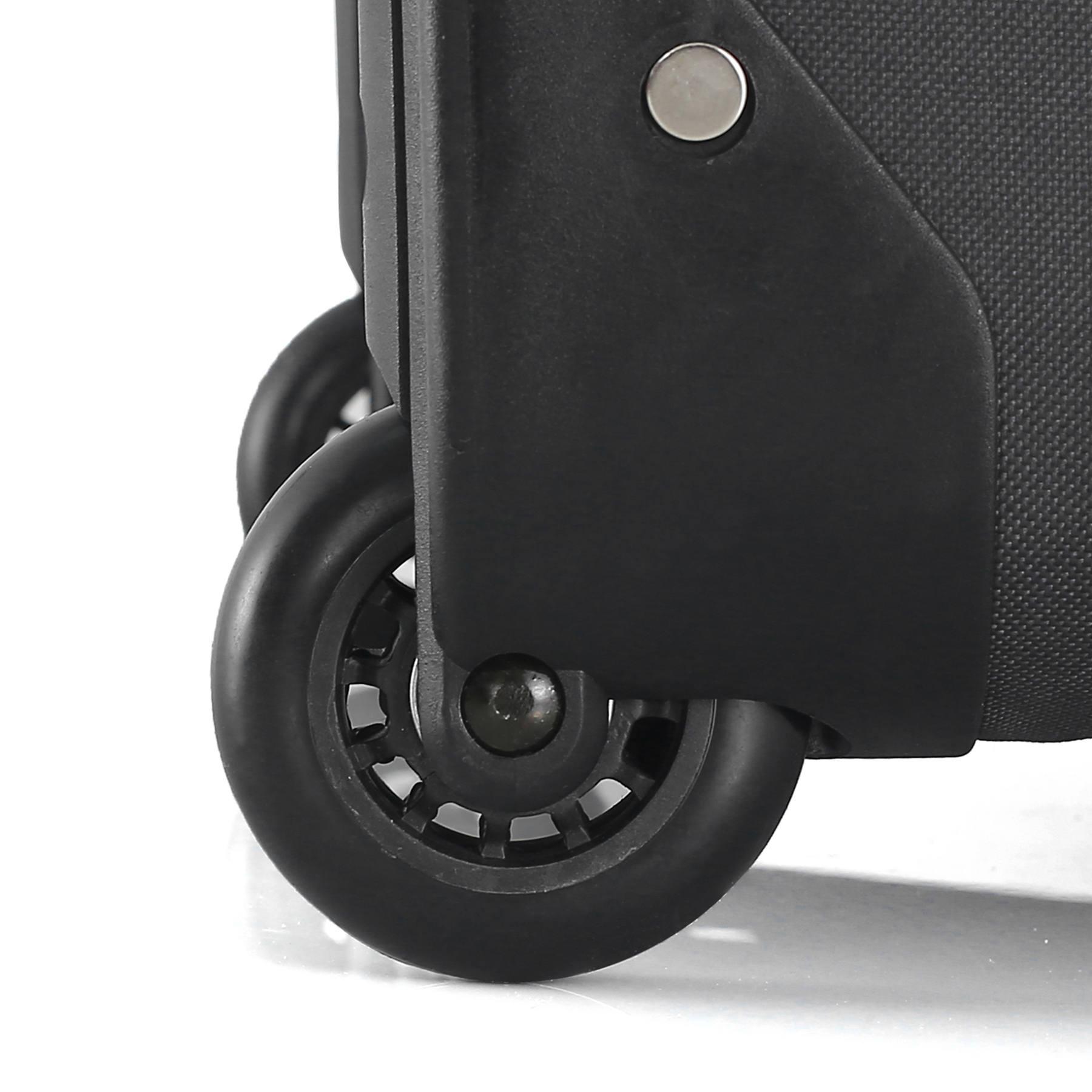 - Приховані колеса великого діаметру - дана модель обладнана двома колесами, що з обох боків захищені пластиковими бортами. Поліуретанові колеса мають достатньо великий діаметр, що забезпечує більш плавне кочення навіть по нерівним поверхням. Валізи з парою прихованих коліс більш захищені від поламок внаслідок ударів.