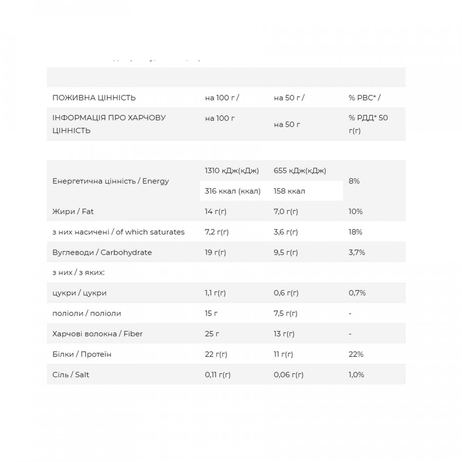 Состав: смесь растительных белков 22% (изолят соевого белка, изолят горохового белка, концентрат рисового белка, подсолнечный белок), пищевые волокна (изомальтоолигосахариды, растворимая кукурузная клетчатка), глазурь с подсластительами 26% ( какао-масло, подсластители [мальтит, стевиол-гликозиды из стевии], какао-порошок, эмульгатор: соевый лецитин, натуральный ароматизатор), кокосовое масло, подсластители (мальтит, стевиол-гликозиды из стевии), ли [изомальтоолигосахариды]), яблочное пюре, подсластитель: мальтит, концентрированный лимонный сок 0,8%, кукурузный крахмал, регулятор кислотности: лимонная кислота), алкализированный какао-порошок 3%, рисовые шарики (рисовка мука) эмульгатор: соевый лецитин, натуральный ароматизатор, морская соль, антиоксидант: витамин Е (токоферола ацетат). Может содержать следы арахиса, молока, орехов.