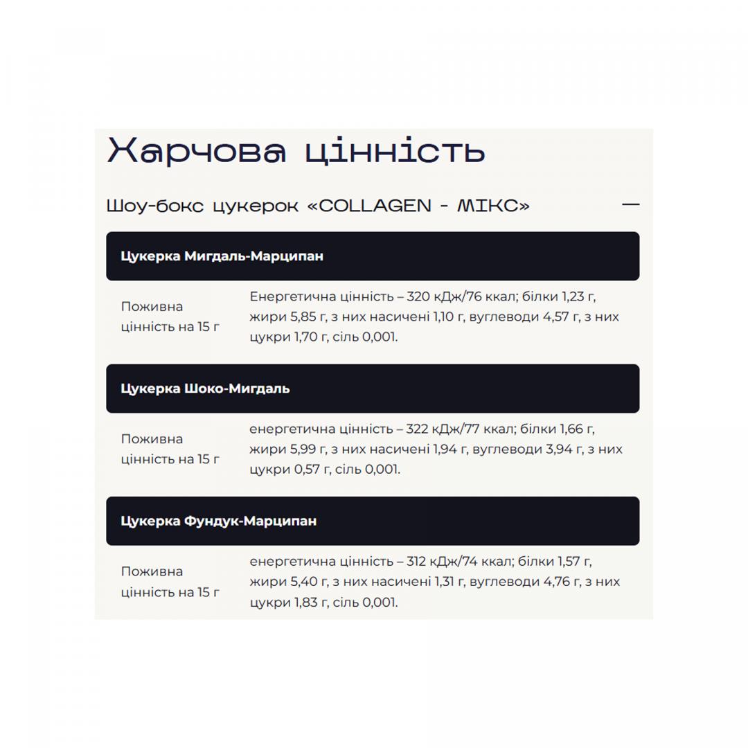 Каждая конфета содержит половину суточной нормы пептидов морского коллагена I типа (2000 мг) и витамина C (50 мг), что способствует здоровью кожи, волос, ногтей и суставов.