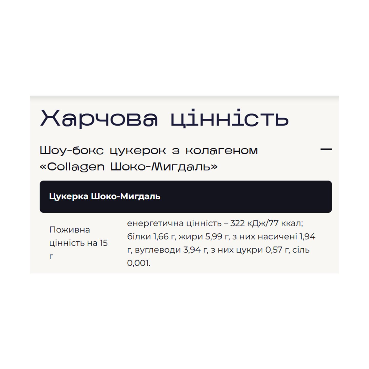 Каждая конфета содержит половину суточной нормы пептидов морского коллагена I типа (2000 мг) и витамина С (50 мг), что способствует здоровью кожи, волос, ногтей и суставов.