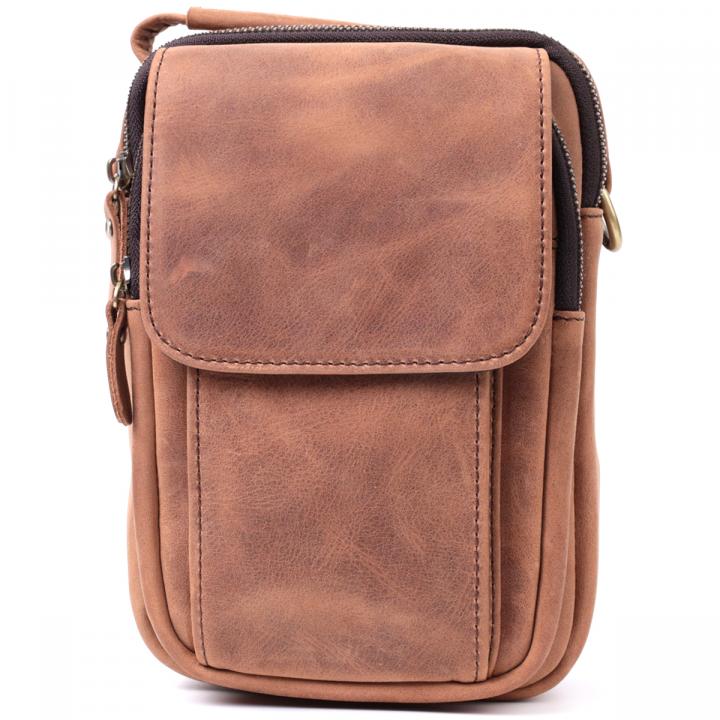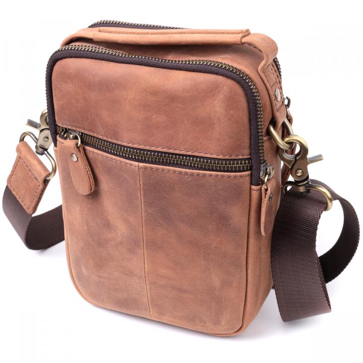Компактная мужская сумка из натуральной винтажной кожи. По краям аксессуар прошит коричневой нитью. Все швы ровные, торчащих ниток нет. Внутри аксессуара плотная текстильная подкладка коричневого цвета. Модель очень удобная, ее можно носить в руках, для этого имеется кожаная ручка, а также на плече в комплекте есть съемный регулируемый текстильный ремень. Модель дополнена качественной фурнитурой медного цвета. Сумка будет вашим идеальным вариантом на каждый день.