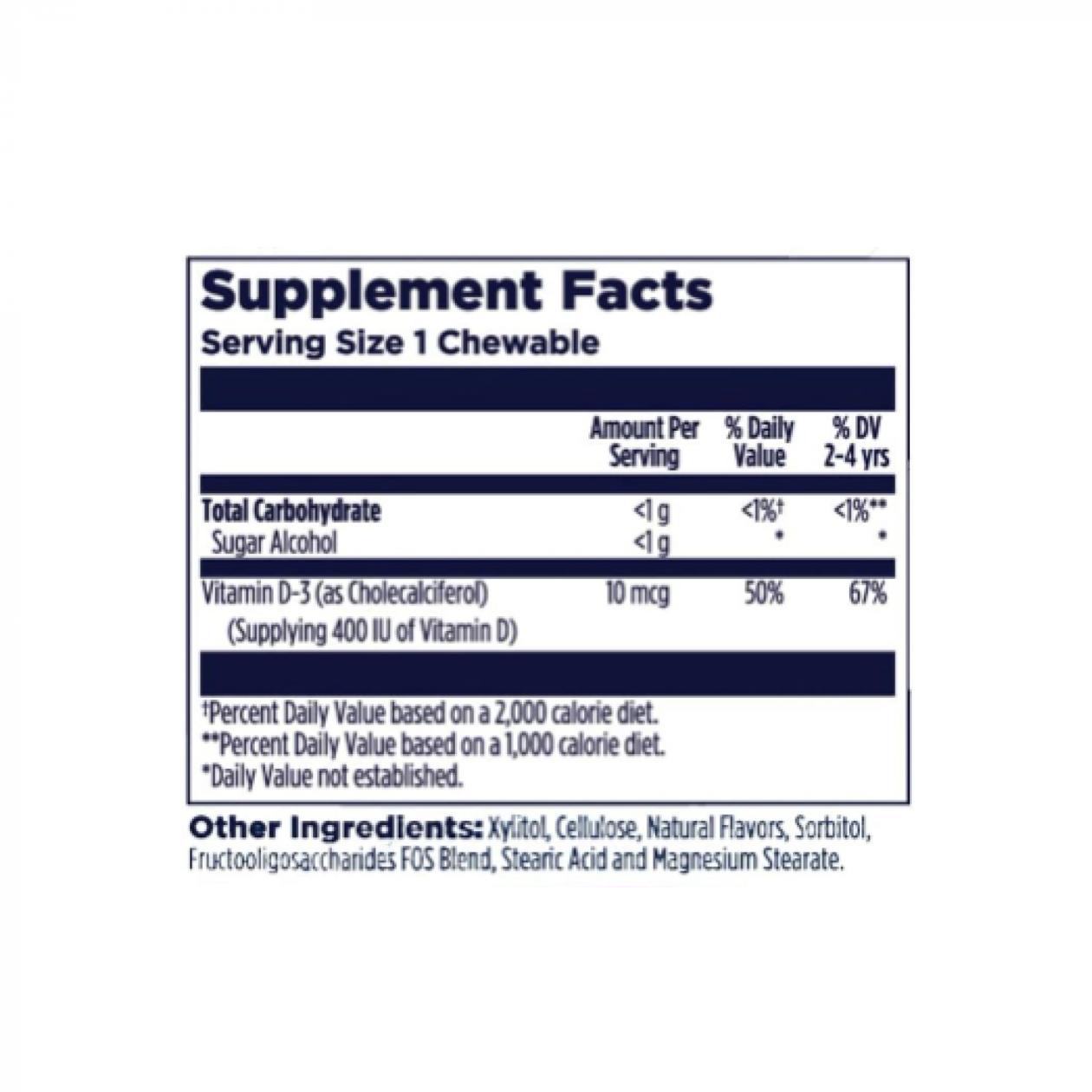 Витамин D для детей для укрепления костей. Обеспечьте детям необходимую прочную поддержку костей с помощью 10 мкг (400 МЕ или 50% ДВ) витамина D3 в каждой жевательной добавке.