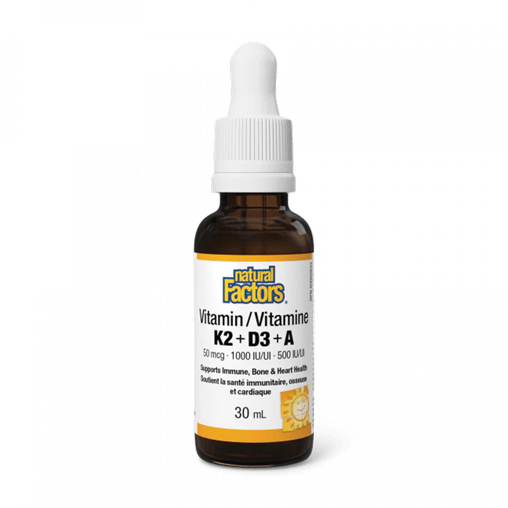 Витамин K2+D3+A от Natural Factors – это легкая для употребления жидкая смесь трех жирорастворимых витаминов, которые играют дополнительную роль в развитии и поддержке костей и зубов. Каждая капля содержит клинически значимую дозу витамина K2 из бобов натто и витаминов D3 и A в их наиболее биоактивных формах.
