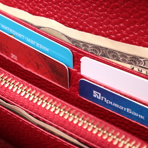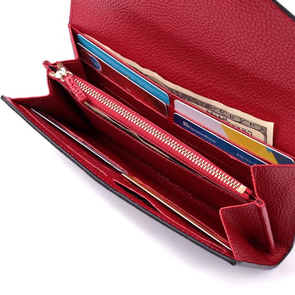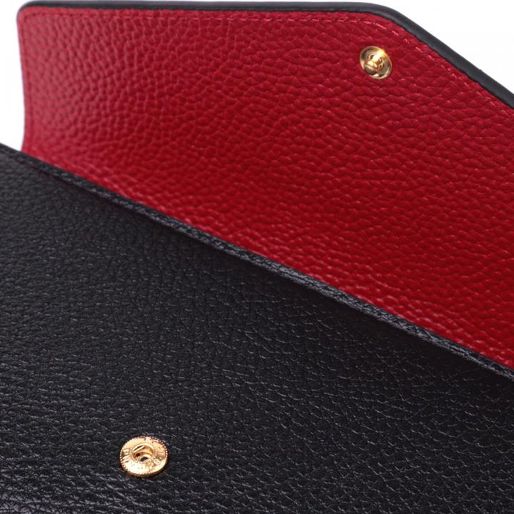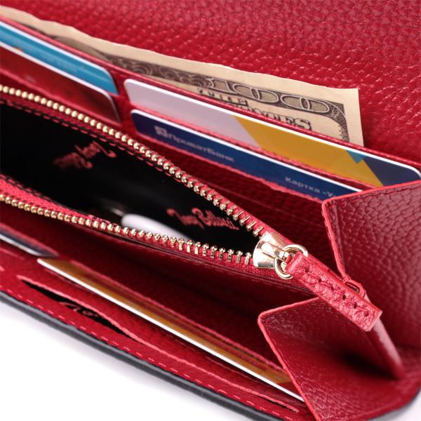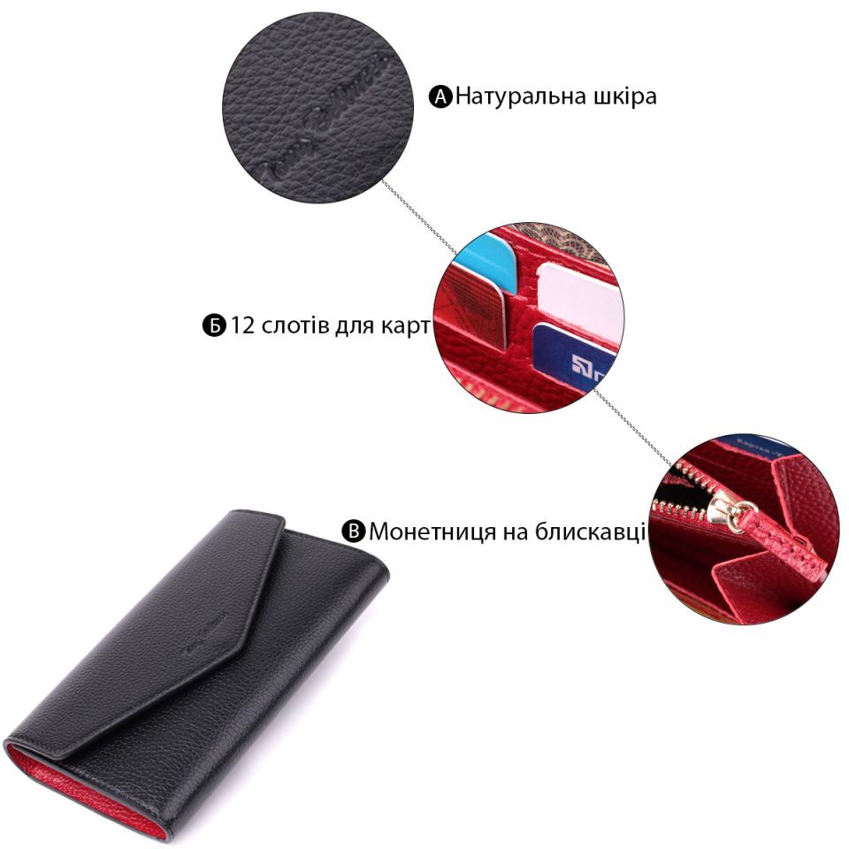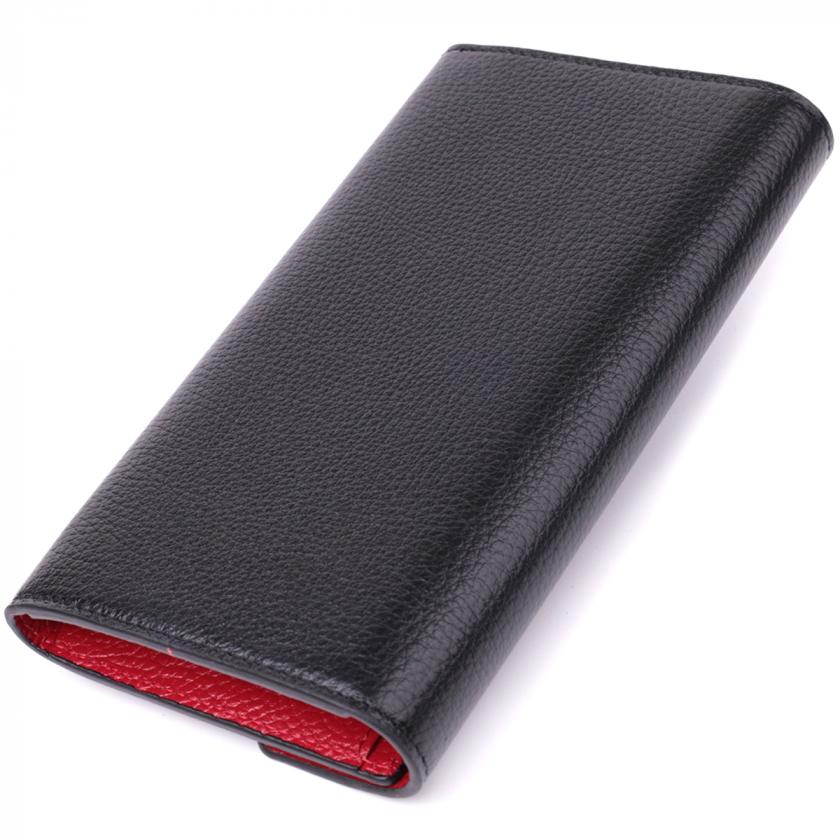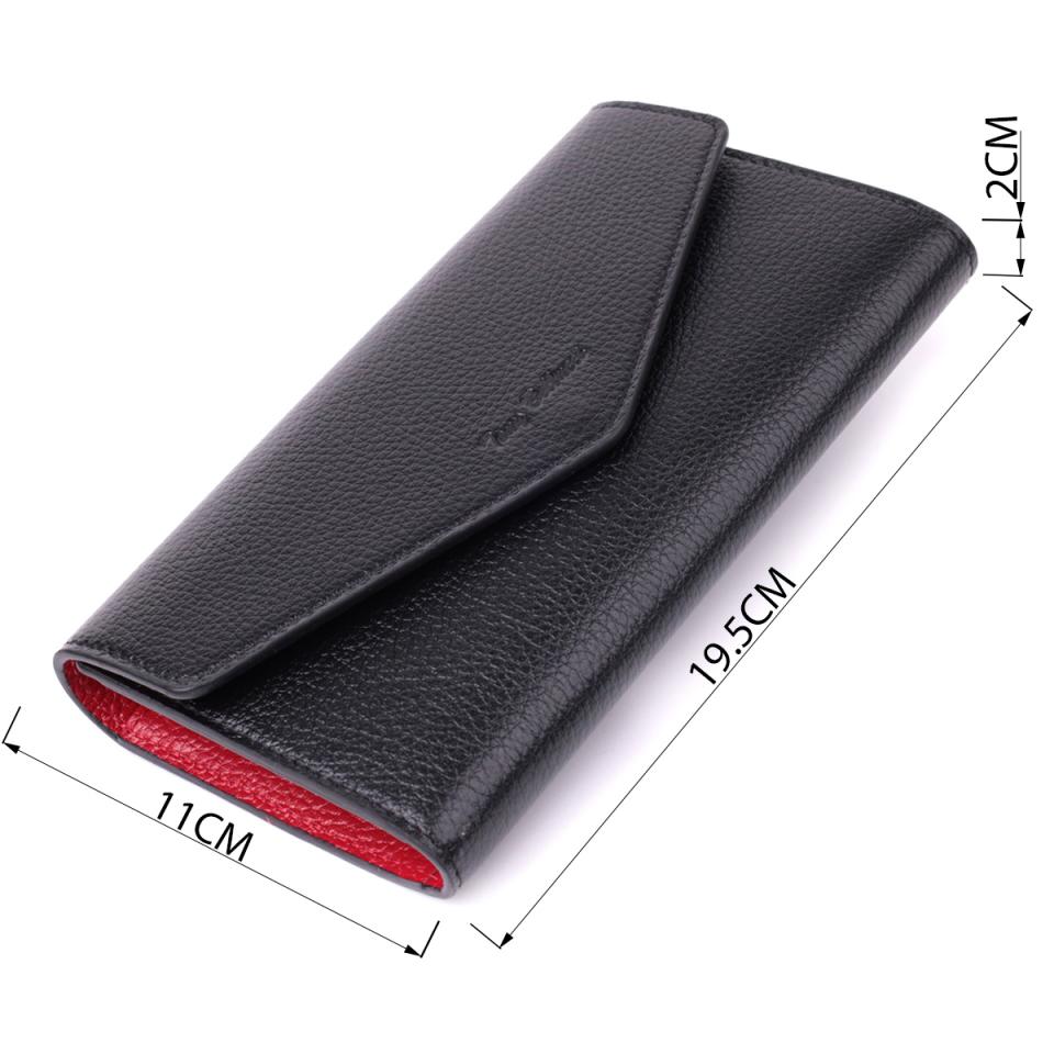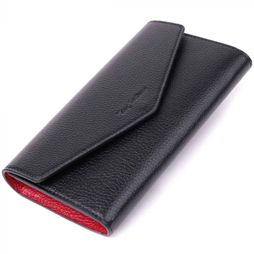 Вместительный кошелек для женщин из натуральной кожи, в комбинации из двух цветов черного снаружи и красного внутри. Аксессуар состоит из двух широких отделений для купюр, двенадцати ячеек для пластиковых карт, двух прилегающих карманов и монетницы на молнии. В изделии использована качественная фурнитура золотистого цвета. Закрывается кошелек треугольным клапаном на кнопку. Аксессуар упакован в фирменную коробочку. Изделия из натуральной кожи всегда будут отличным подарком для близкого человека.
