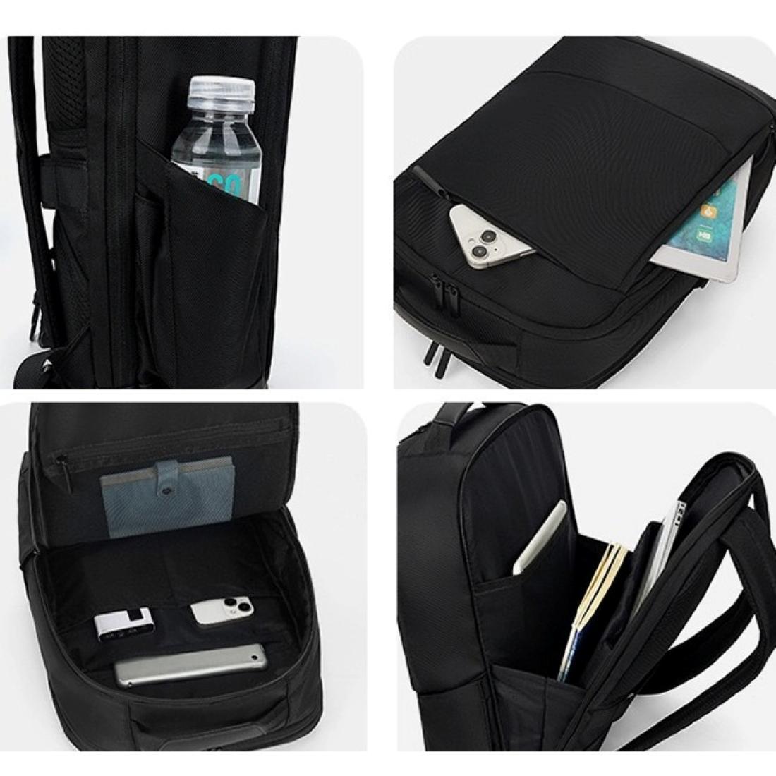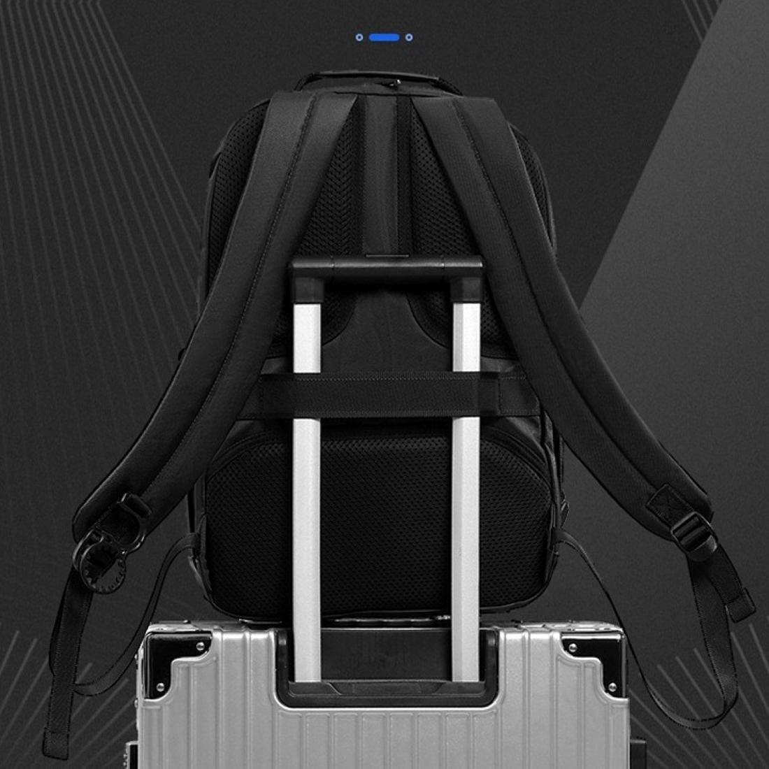 Рюкзак оснащен плотной «дышащей» спинкой с сетчатыми вставками и мягкими регулируемыми лямками анатомической формы, обеспечивающими комфорт в течение всего дня. На задней части расположена специальная лента для крепления рюкзака на ручку чемодана. Сверху есть прочная усиленная ручка для удобной переноски в руках.